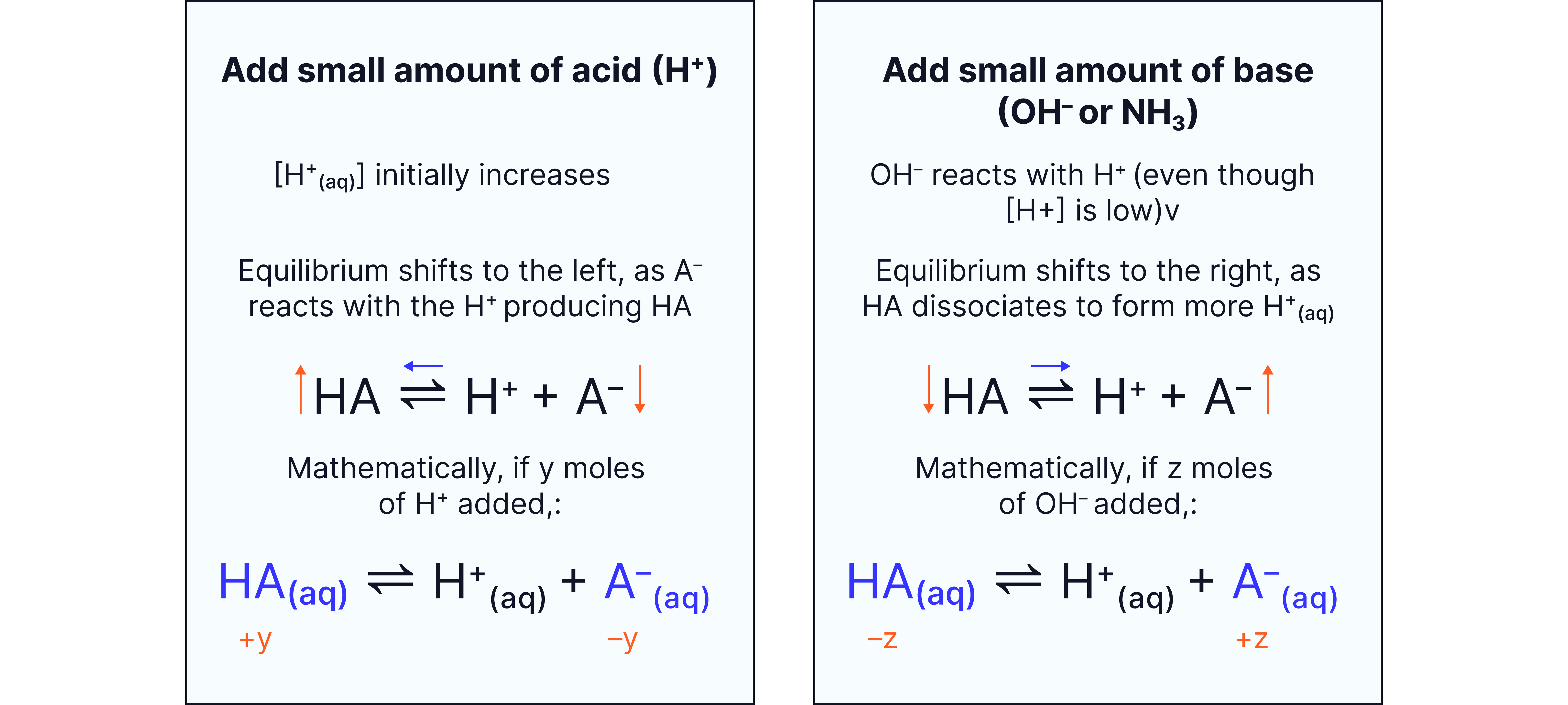 Buffers resist changes in pH on addition of small amounts of acid or base according to Le Chatelier’s Principle which says: