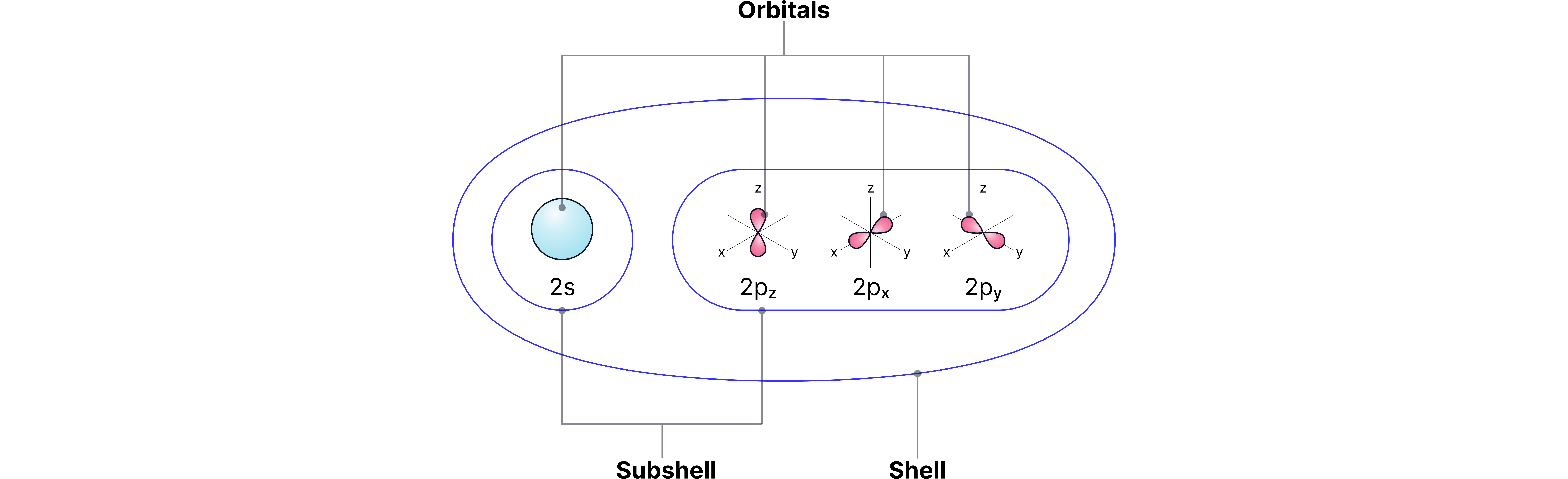 Subshells: each shell is split into subshells labelled s, p, d, f.