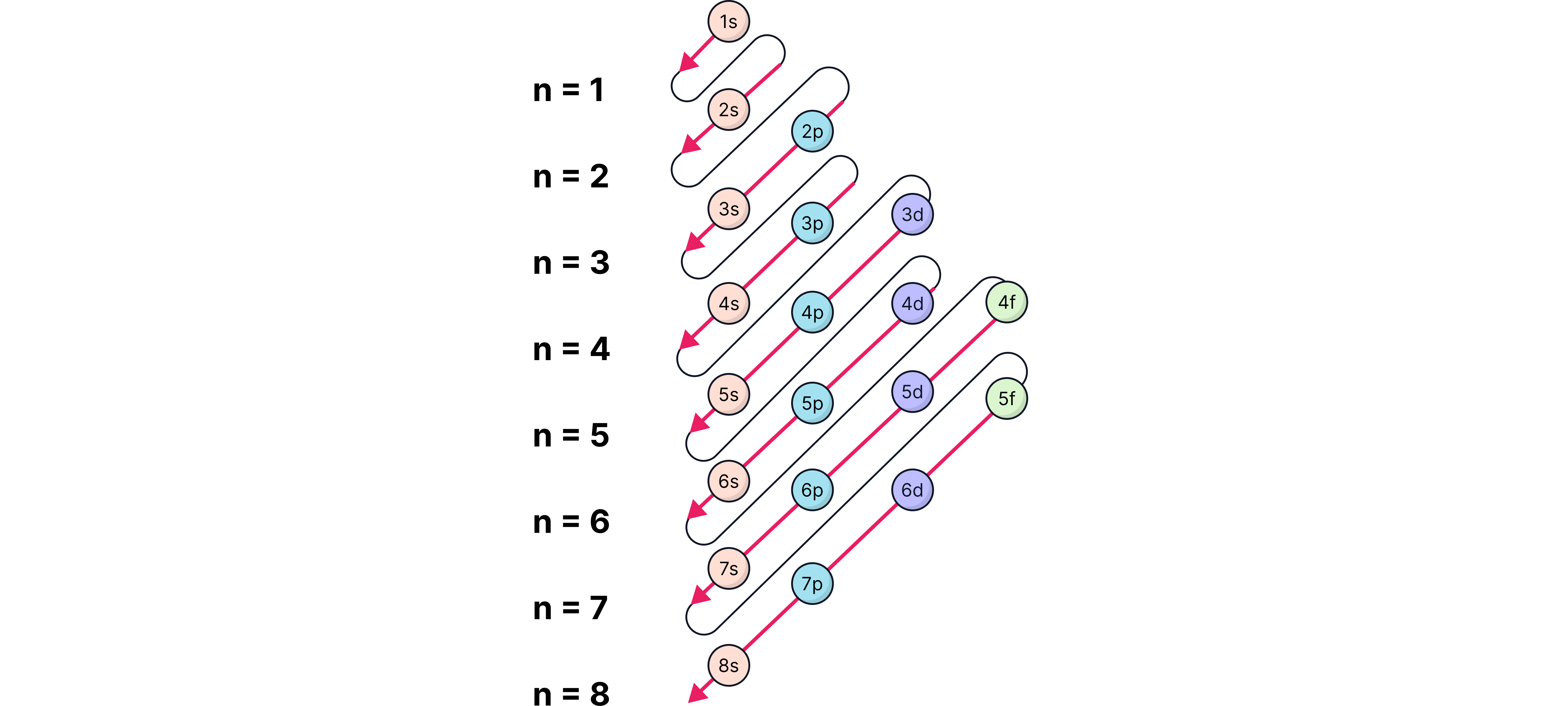 Shells (principal energy levels): labelled n = 1, 2, 3, 4 …