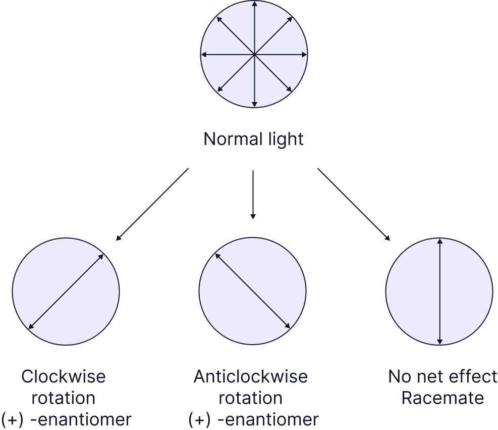 One exception is the effect that each enantiomer has on plane polarised light. One enantiomer will cause a clockwise rotation (+) of plane polarised light, and the other enantiomer will have an anticlockwise rotation (-) of plane polarised light. They will rotate in opposite directions but by the exact same amount.