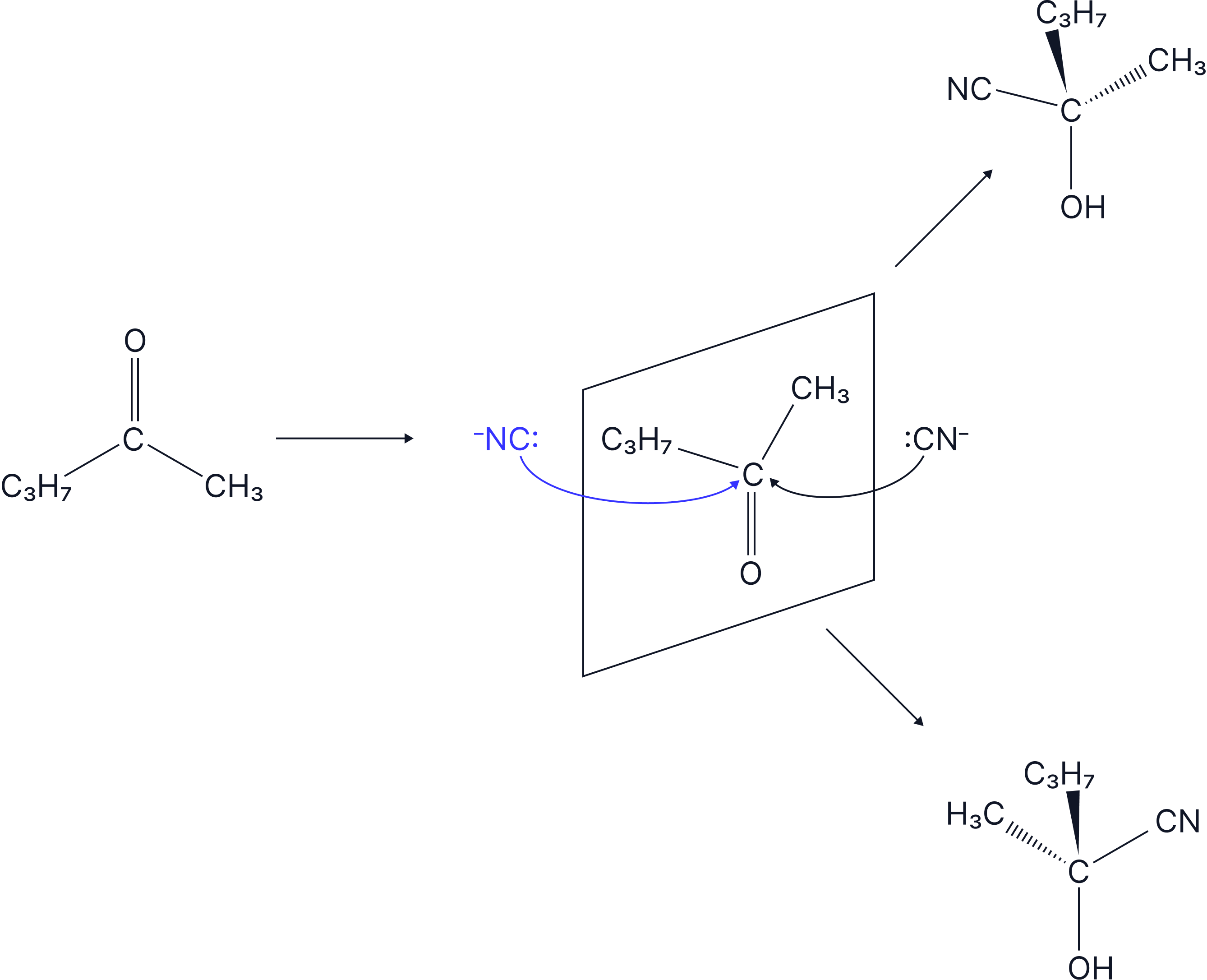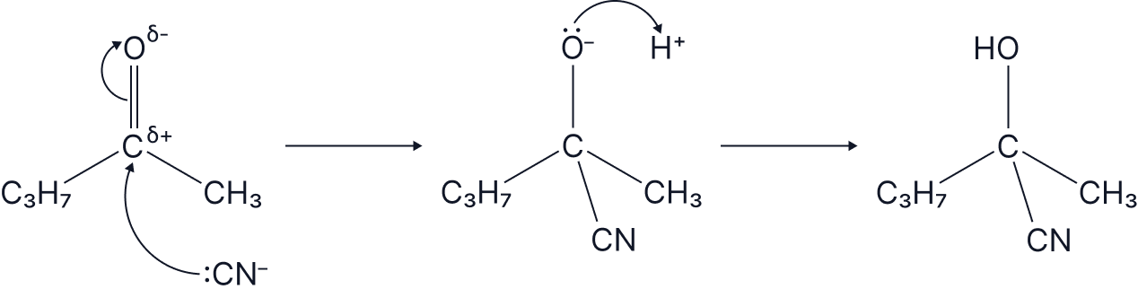 Here, there is an equal chance of attack of :CN- from the back and from the front of the planar carbonyl group.