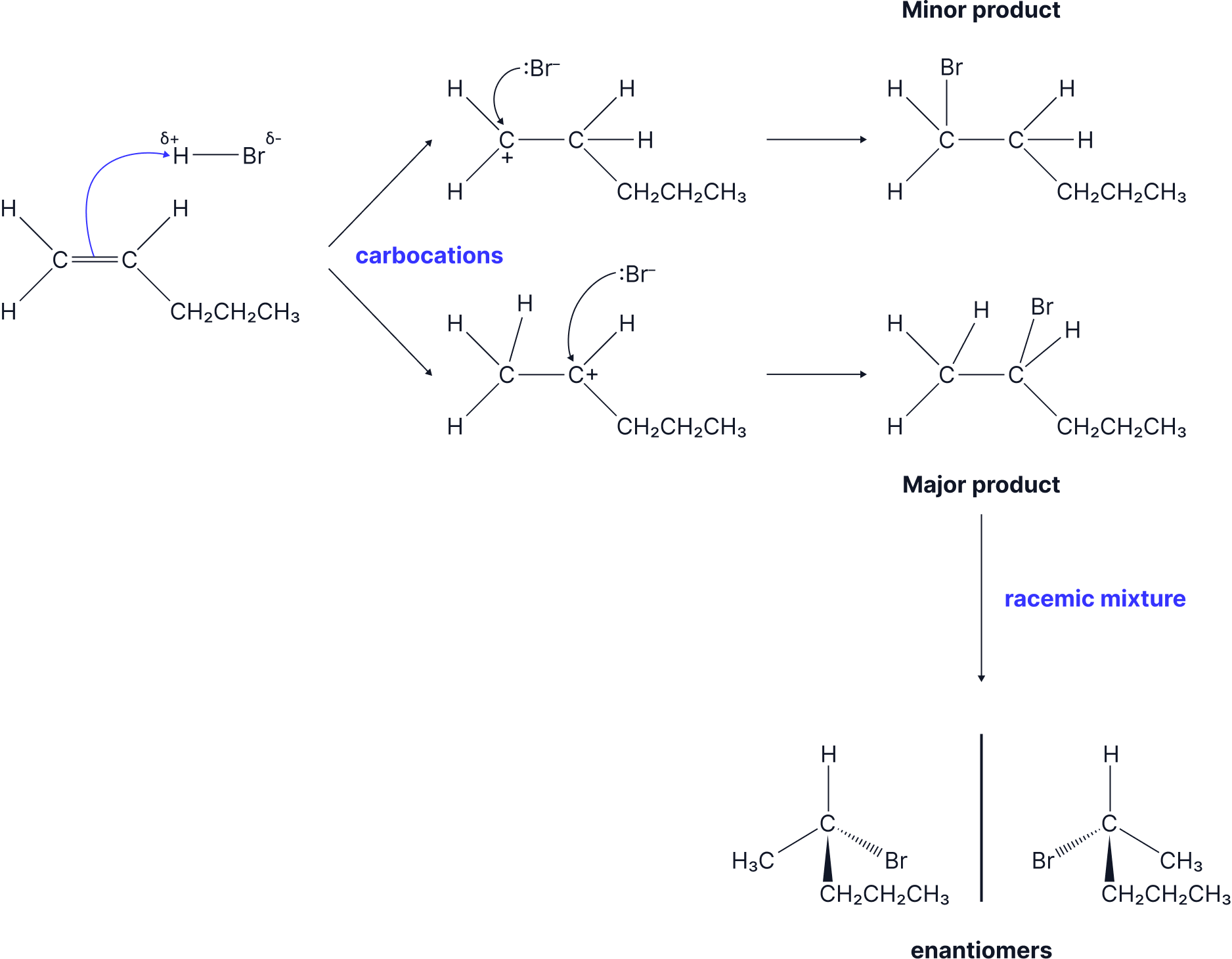 Another reaction which forms a racemic mixture is the Electrophilic Addition of HBr to an unsymmetrical alkene to form a halogenoalkane.