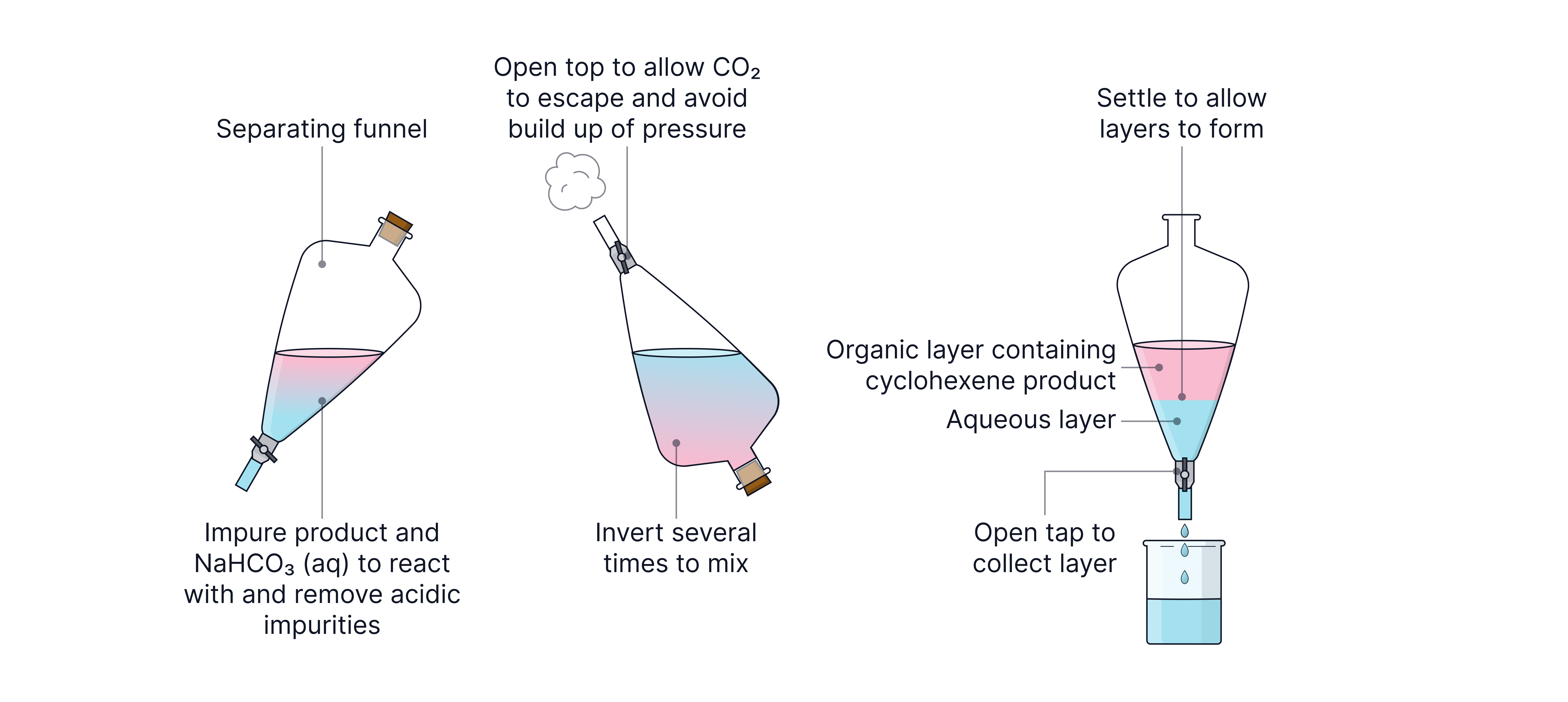 This separates the mixture into two layers. The organic layer containing the cyclohexene product forms at the top due to lower density than water (the aqueous layer).