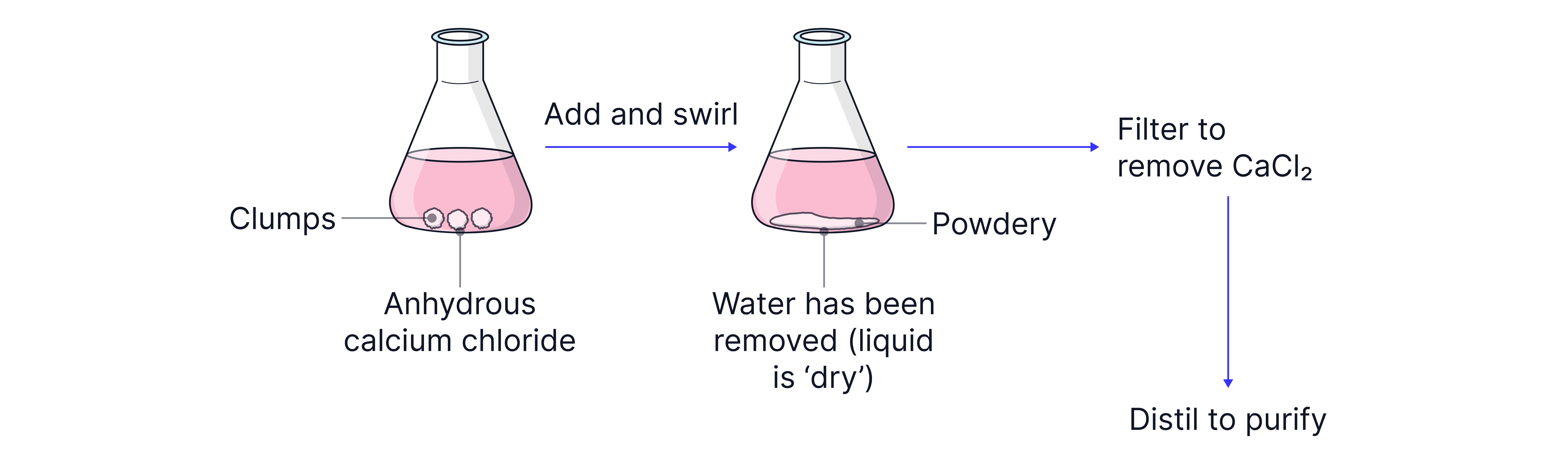Any remaining water can then be removed from the organic layer by adding solid anhydrous calcium chloride which is a drying agent.