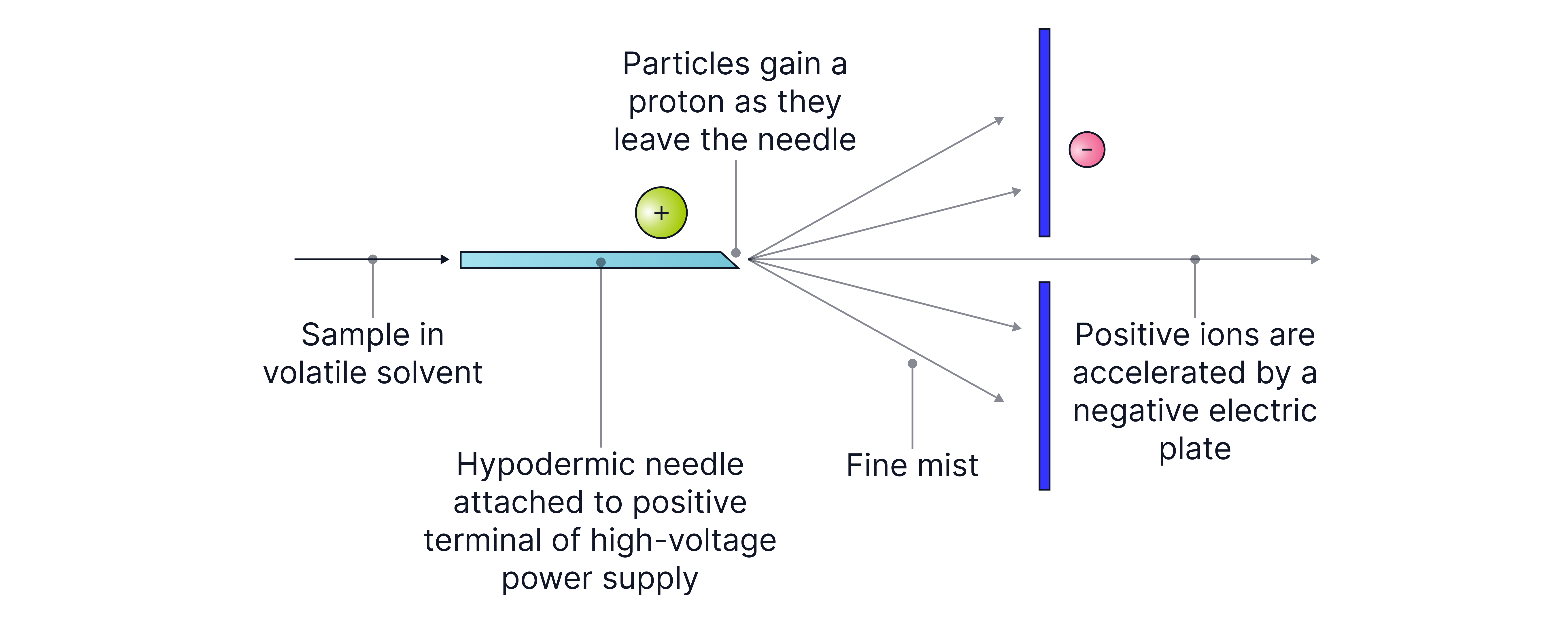 1. The sample is dissolved in a polar solvent and passed through a fine needle at high voltage.