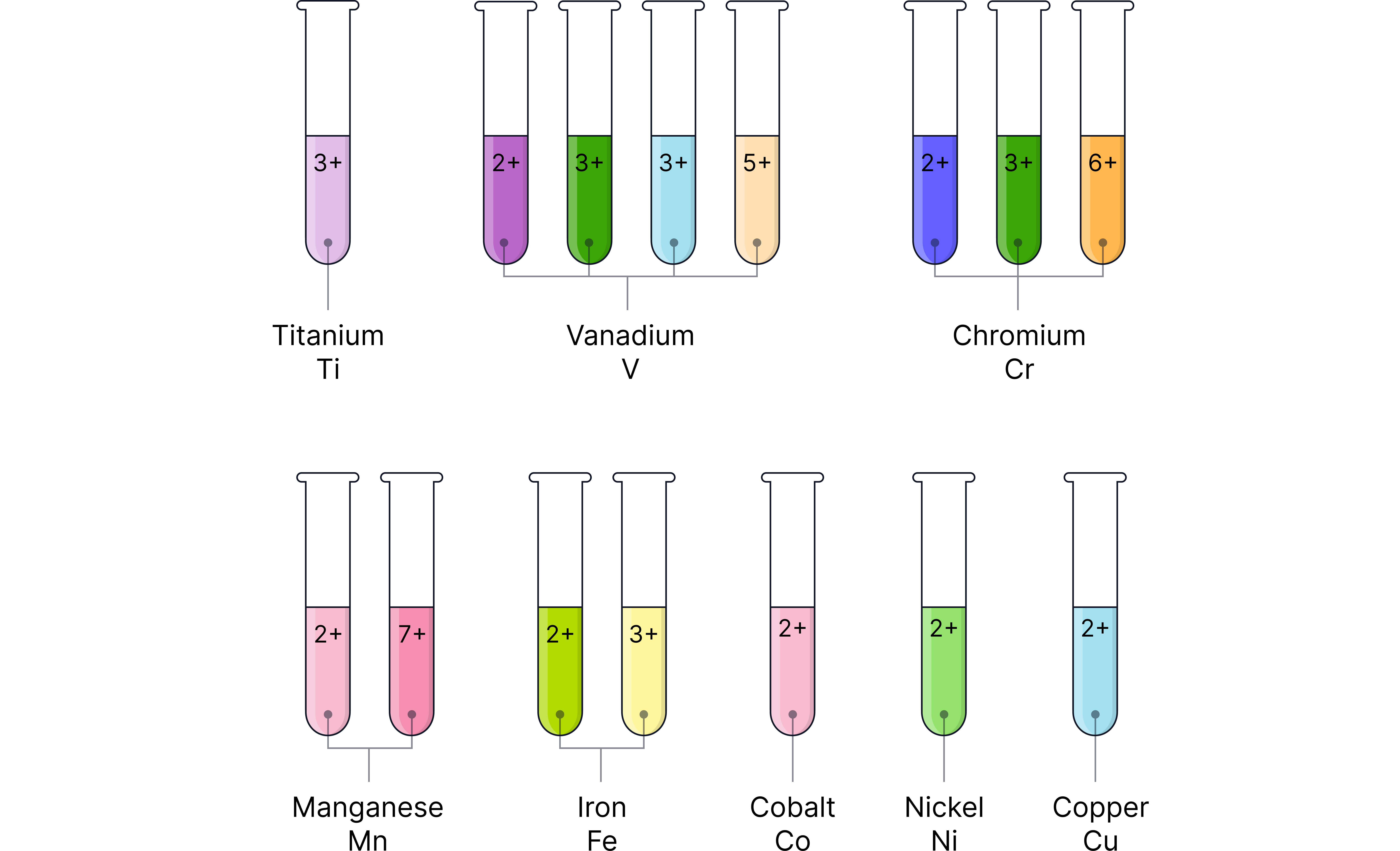 Colours of these species in solution can be assessed. They are easily remembered using the mnemonic ‘You Better Get Vanadium‘ (Yellow Blue Green Violet).