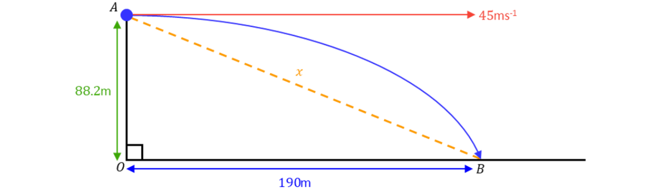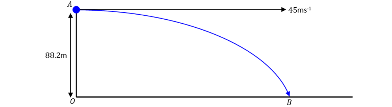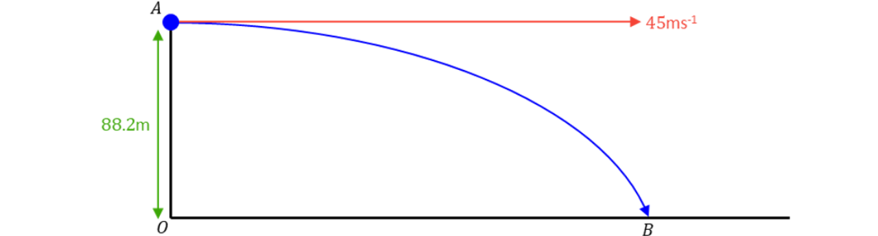 Suppose that is the time taken for the particle to reach . The vertical motion is modelled by SUVAT, and the horizontal motion is modelled by Distance Speed Time. As we are projecting horizontally, the initial vertical velocity is .