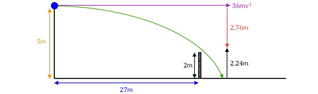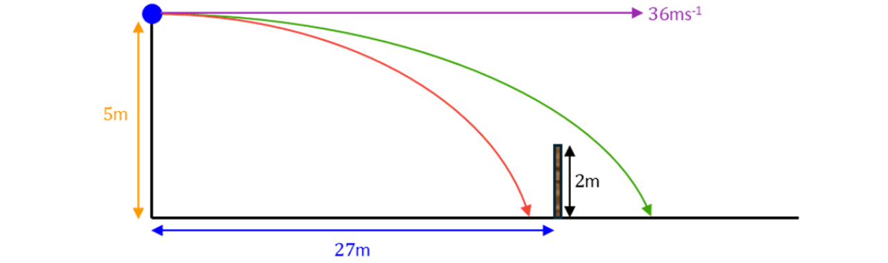 Suppose that is the time taken for the stone to reach the wall. The vertical motion is modelled by SUVAT, and the horizontal motion is modelled by Distance Speed Time. As mentioned before, we are projecting horizontally so the initial vertical velocity is .