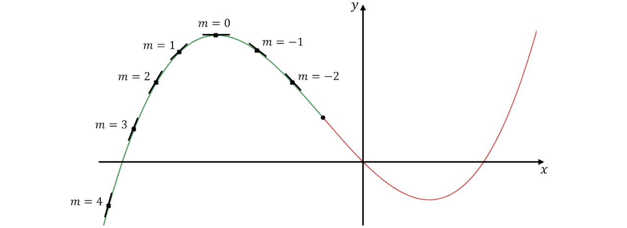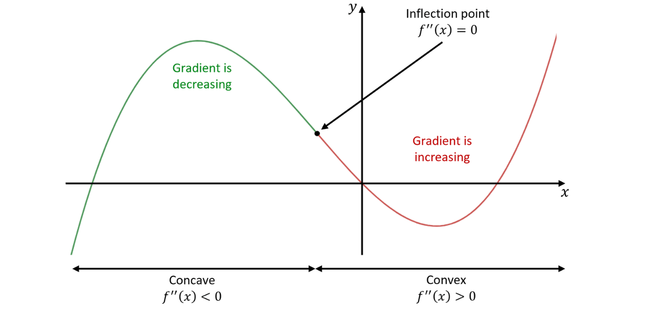 For the green region of the graph, notice how the gradients are getting smaller. This means that the rate of change of the gradients is negative or that . This is the concave part of the function.
