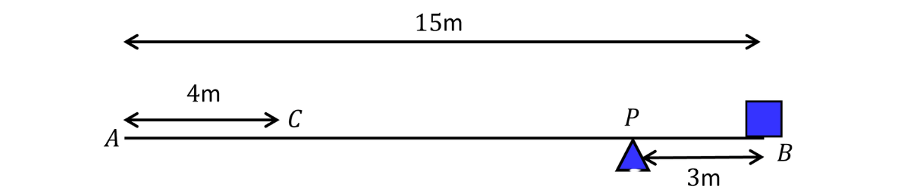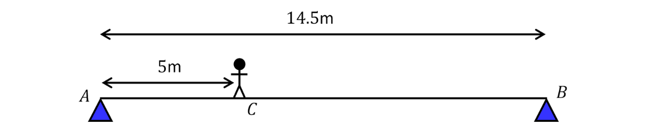 A wooden plank has a length of m and a mass of kg. The plank is supported by two smooth pivots at its two ends, and . Maria has a mass of kg and stands on the plank at point , where m. The plank is in horizontal equilibrium and the magnitudes of the reactions on the plank at and are each equal to Newtons. The plank is modelled as a non-uniform rod, and the woman is modelled as a particle.