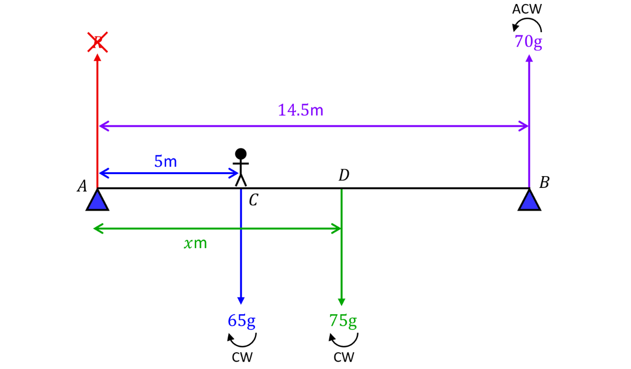 Because the plank is in horizontal equilibrium, the net moment is , meaning that it isn’t rotating in any direction. Therefore, we equate the clockwise and anti-clockwise moments.