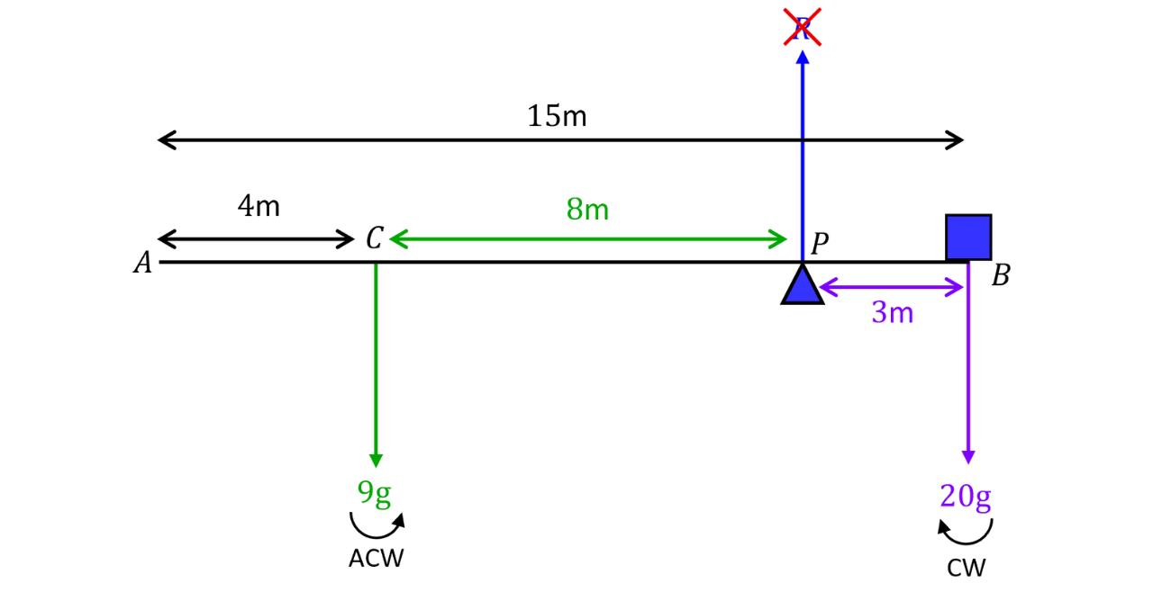 • The force at acts directly on the pivot, so the perpendicular distance is . Therefore, we can exclude this from our calculation.