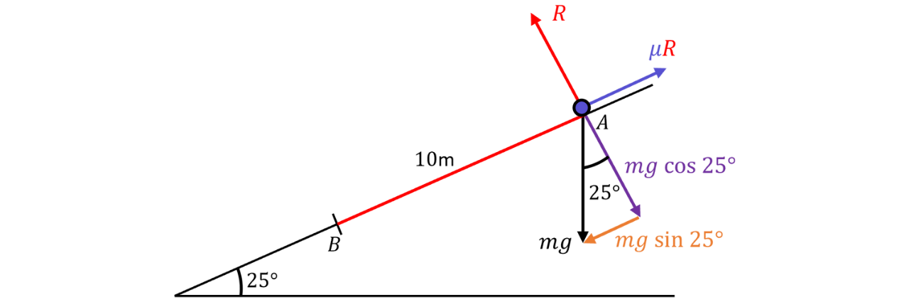 Two points and are m apart on a rough plane inclined at to the horizontal. A particle of mass kg is held at rest on the plane at . The coefficient of friction between and the plane is . The particle is released.