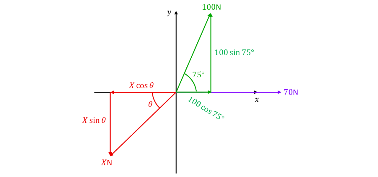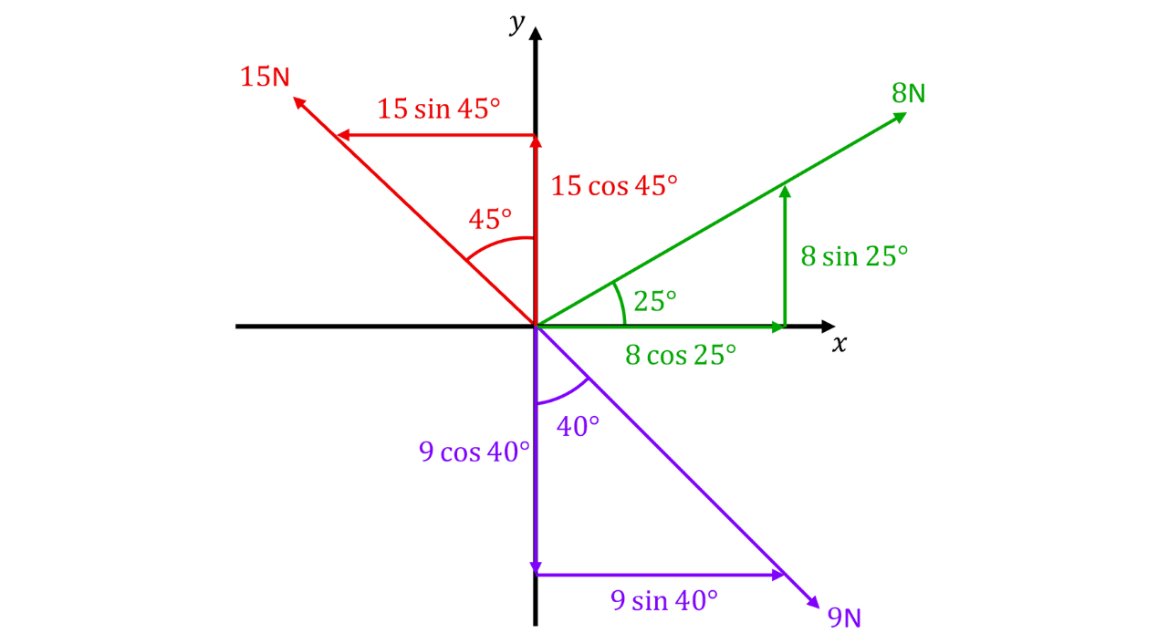If a force acts at an angle measured from the axis, its components form a right-angled triangle. Using SOHCAHTOA, we can write: