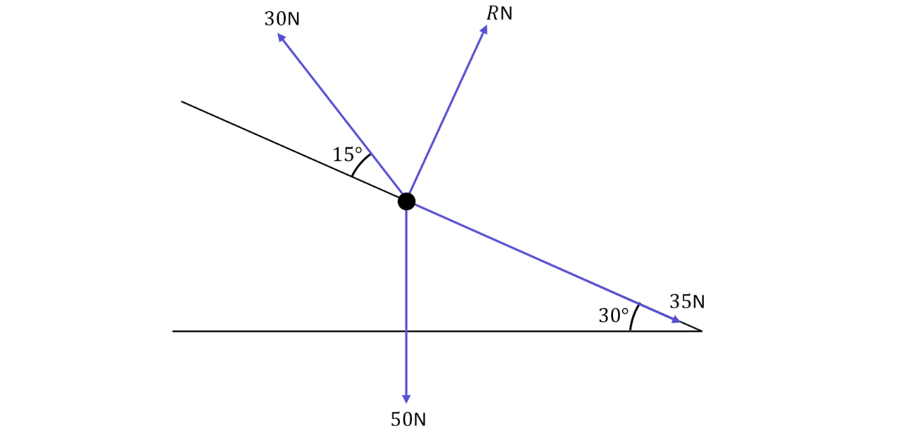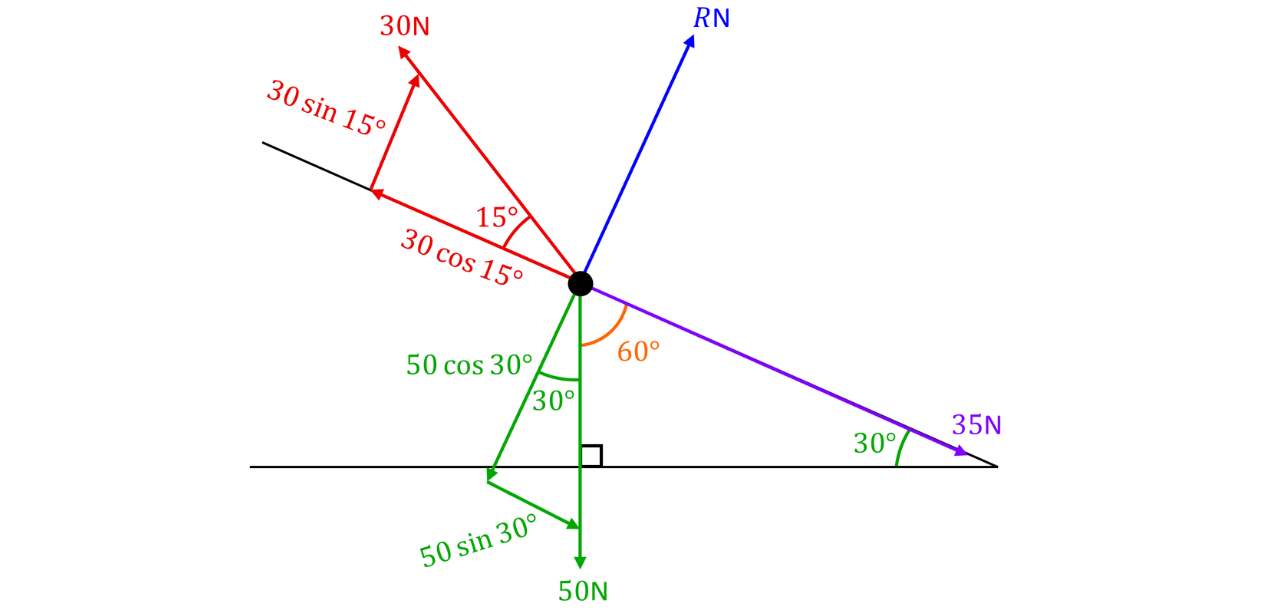 4) If needed, use these vectors to work out values such as the magnitude (using Pythagoras’ Theorem with the parallel and perpendicular components) and the direction of the force (using SOHCAHTOA) with the components to find the angle the force makes with the axis. We can also find unknown forces and angles by resolving and then forming and solving equations.