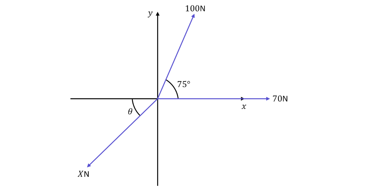 The diagram shows three forces acting on a particle in equilibrium. Find the unknown force and the angle . Give your answers to decimal place.