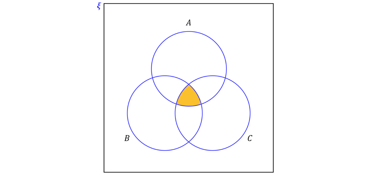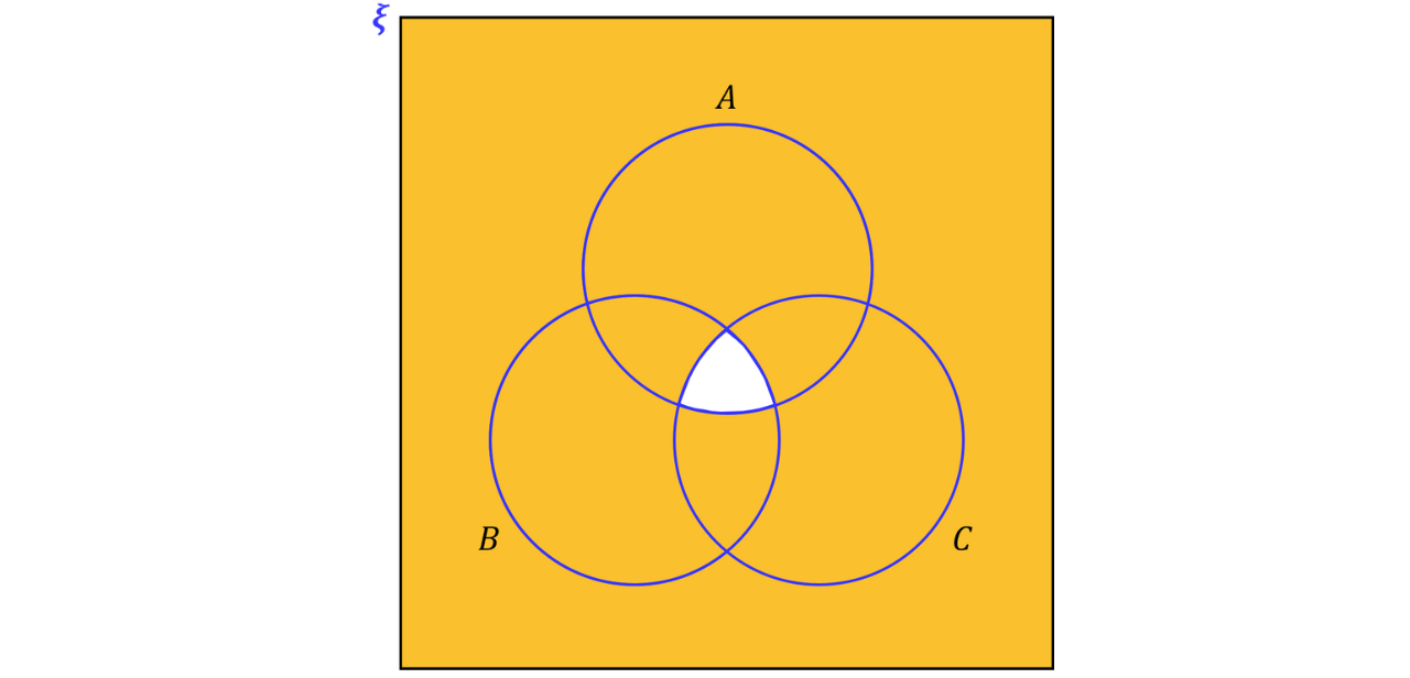 This region can be written as since an element only needs to be missing from at least one of the sets , or to be included. However, this can be rewritten as , which represents all elements except those that belong in all three sets.