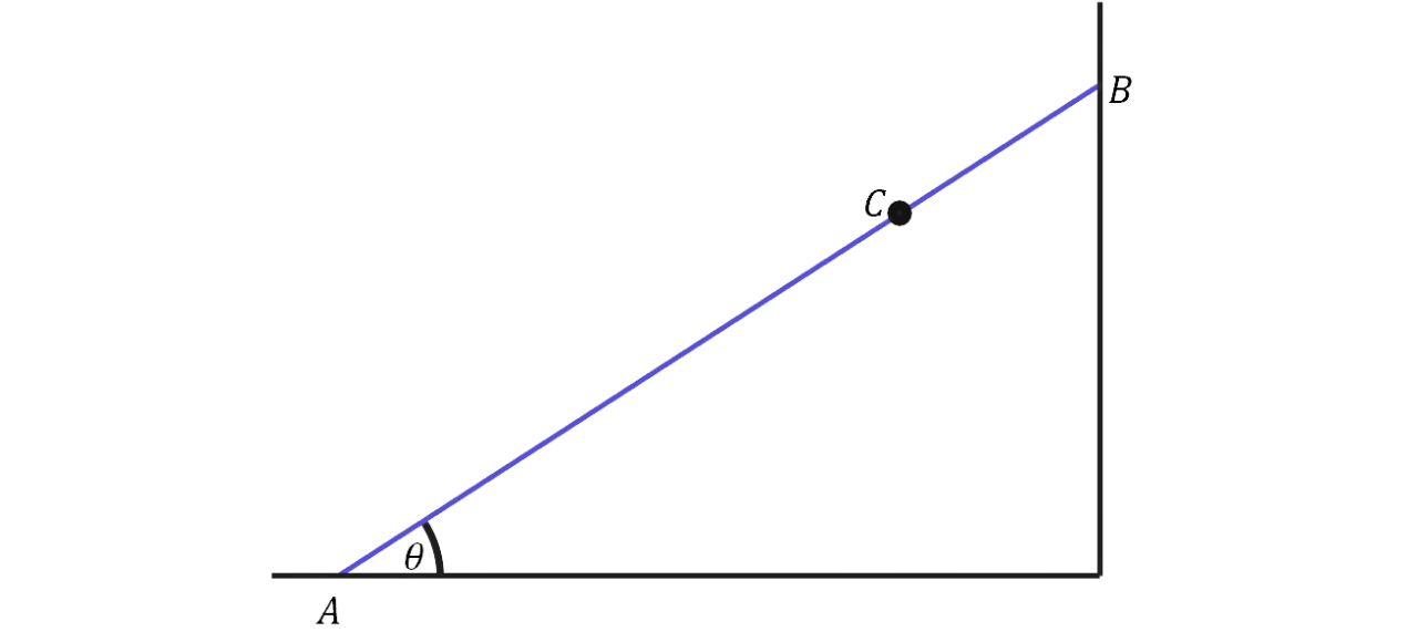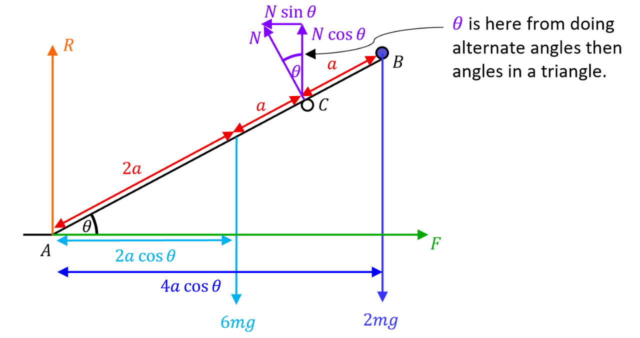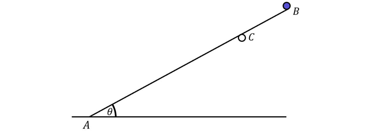 A rod of length and mass has one end resting on rough horizontal ground. A particle of mass rests at the other end . The rod rests against a smooth horizontal peg , where . The rod is modelled as uniform and lies in a vertical plane perpendicular to the peg. It rests in equilibrium making an angle with the horizontal where . The coefficient of friction between the rod and the ground is .