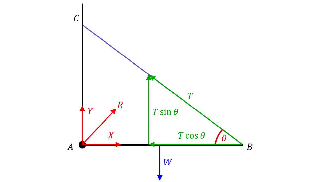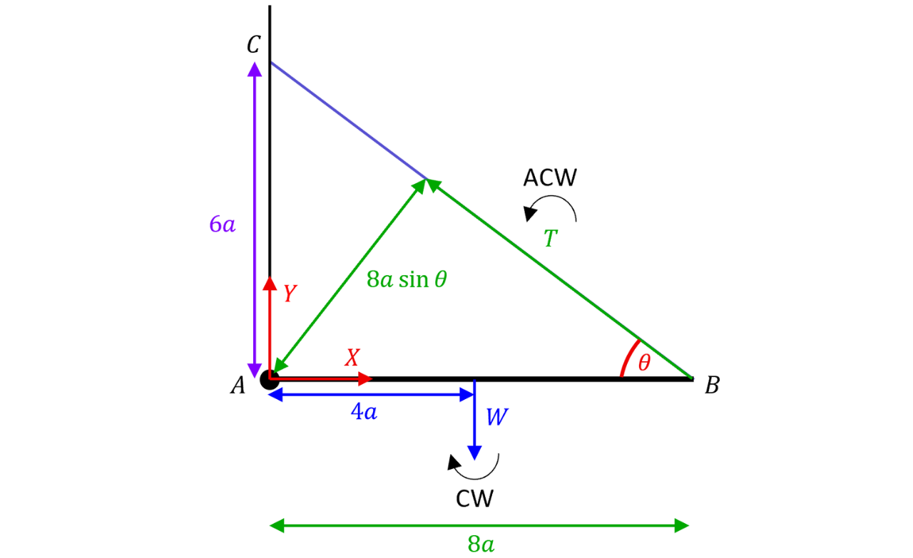 We do not equate forces yet as there will be two equations with more than two unknowns which are unsolvable. We will take moments first about to eliminate all unknowns apart from and , which then can be solved. As we are taking moments about , we eliminate and as they are applied directly on the hinge and give no moment.