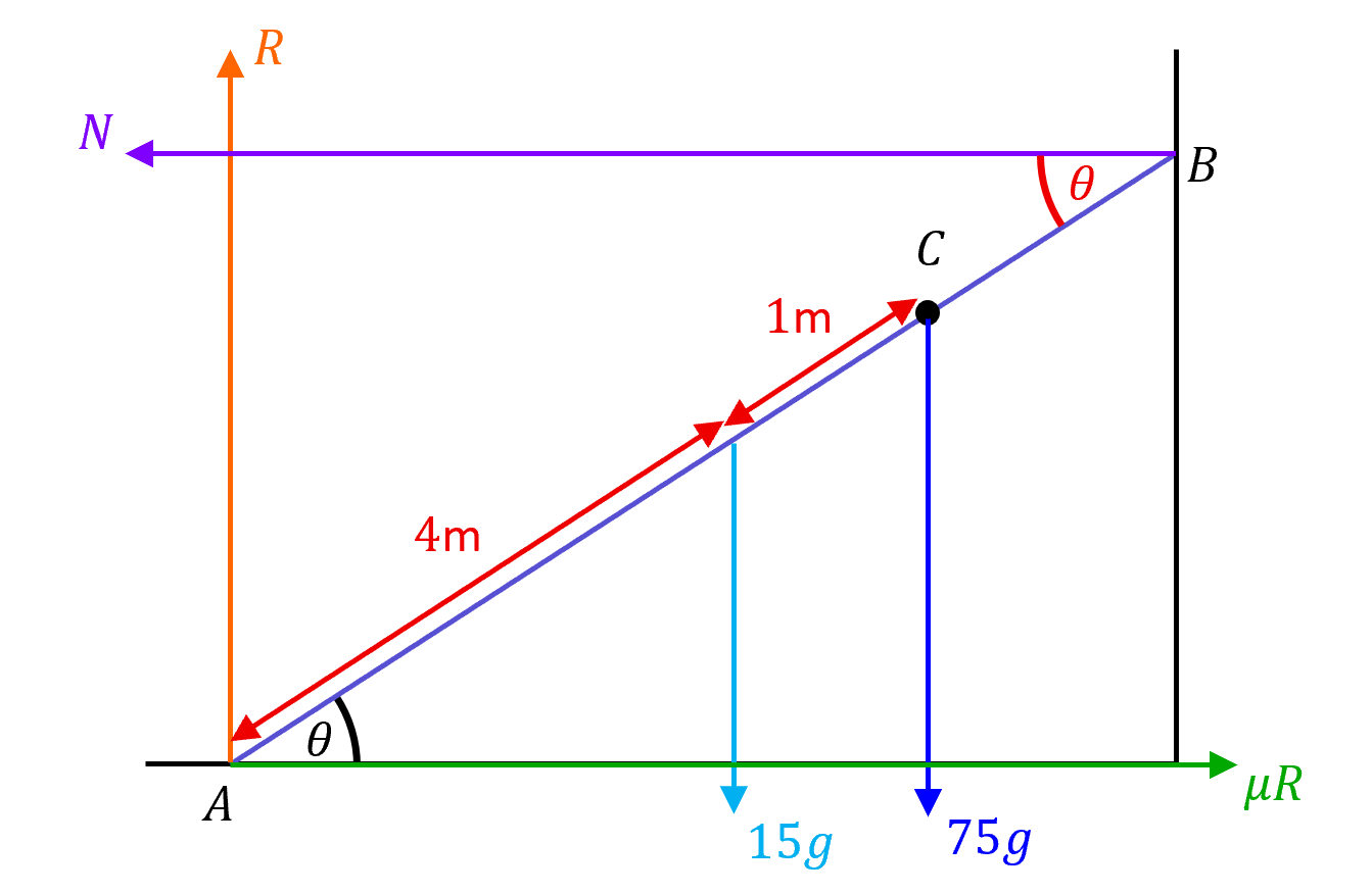 A teenager of mass kg stands on the ladder at a point where m. The ladder is modelled as a uniform rod and is at the point of slipping, and the teenager is modelled as a particle.
