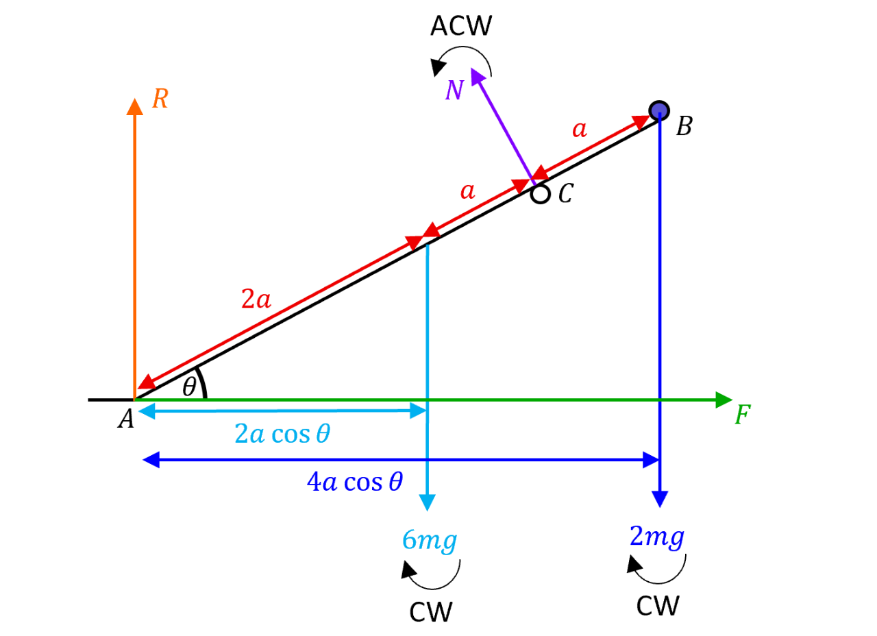 We do not equate forces yet as there will be two equations with more than two unknowns which are unsolvable. We will take moments about first to eliminate all unknowns apart from . When we take moments about , we can eliminate and as these two forces are acting through point directly which produce no moment.