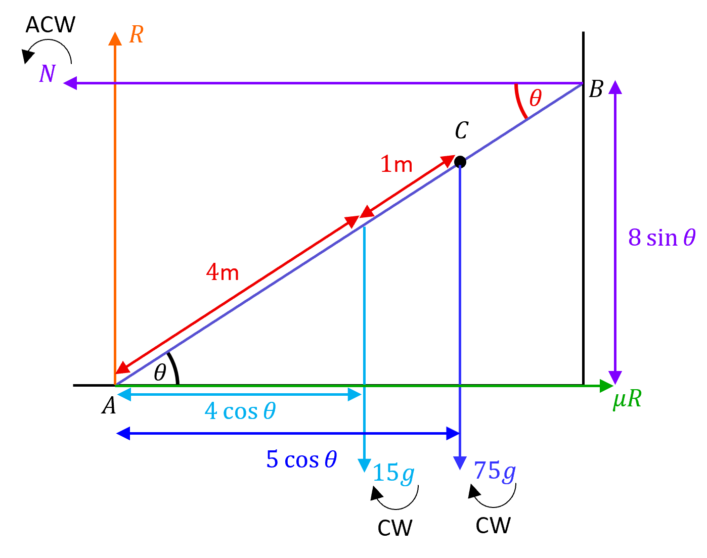• - the maximum value of friction since we are in limiting equilibrium acting in the opposite direction of where the ladder would move if friction did not exist.