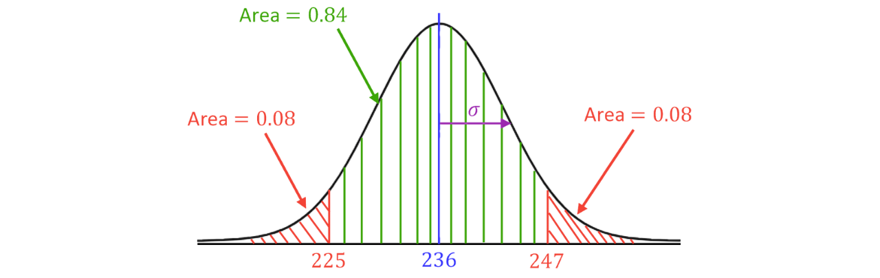 Since and are both away from the mean, they are symmetrical about the mean. Therefore, if the middle area is , the end tails are each which means we can write a cumulative statement for as .
