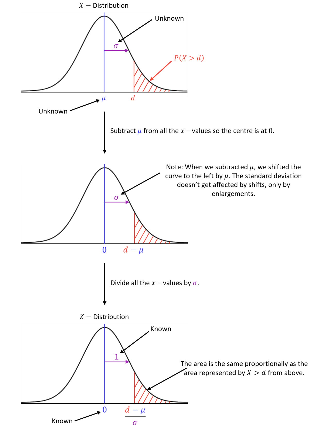 Sometimes, we may get normal distribution questions where we don’t know what the mean and standard deviation are. For these, we must use transformations to turn our distribution into the standard normal distribution, which has a mean of and a standard deviation of . We call this the Distribution where .