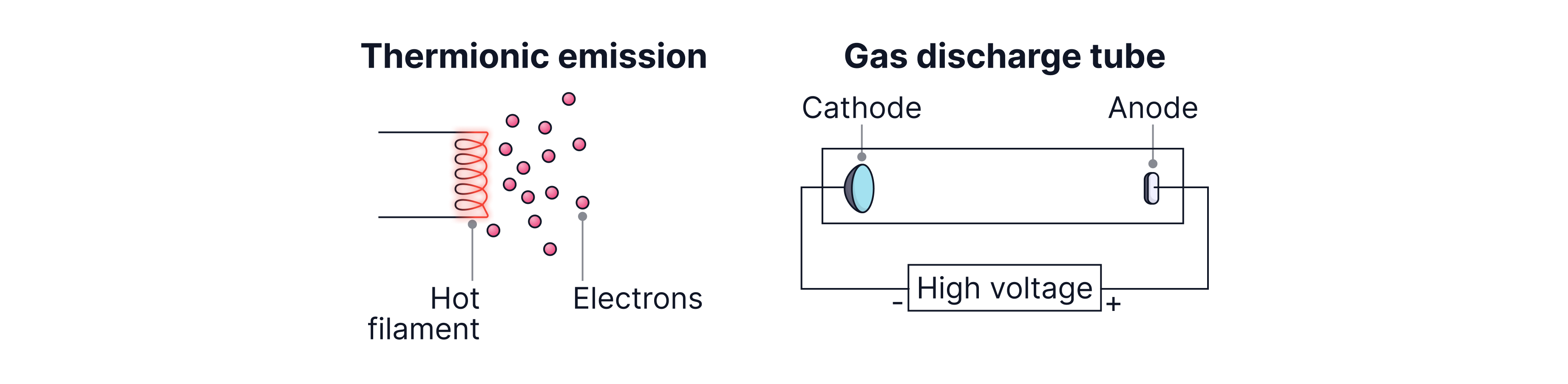 Thermionic emission: Heating a metal cathode gives electrons enough energy to escape the surface.