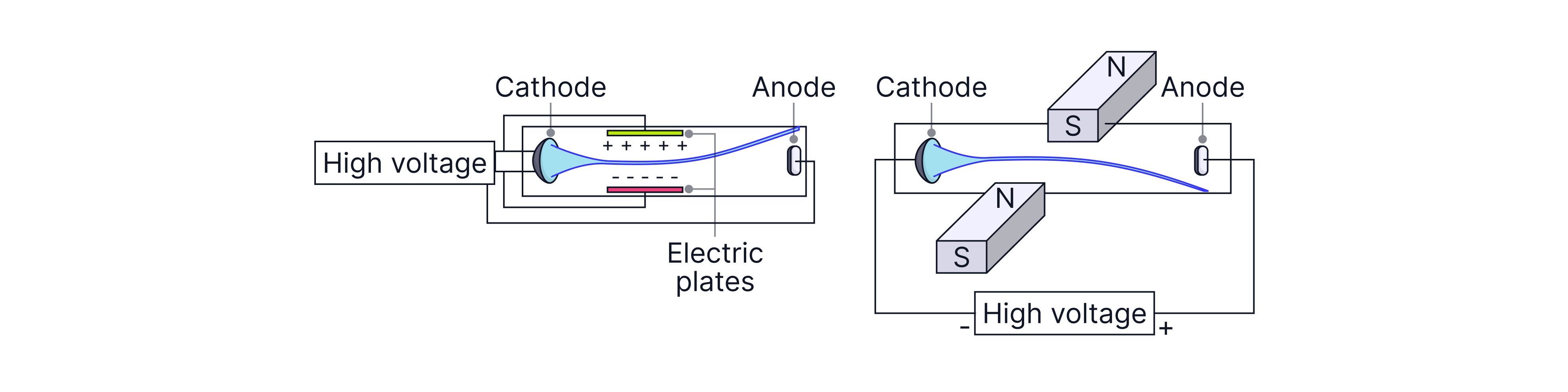 Set-up: A cathode ray beam is produced in a tube. The beam passes through a region where an electric field can be applied (e.g. between charged plates). A magnetic field can also be applied across the beam using magnets/coils.