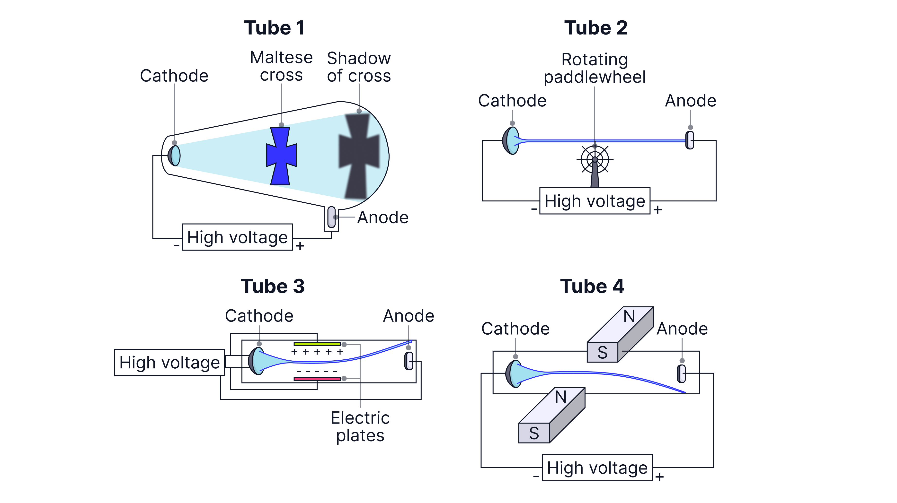 Set-up: A Maltese cross is placed in the path of the cathode rays inside the tube, with a fluorescent/glowing screen at the far end.