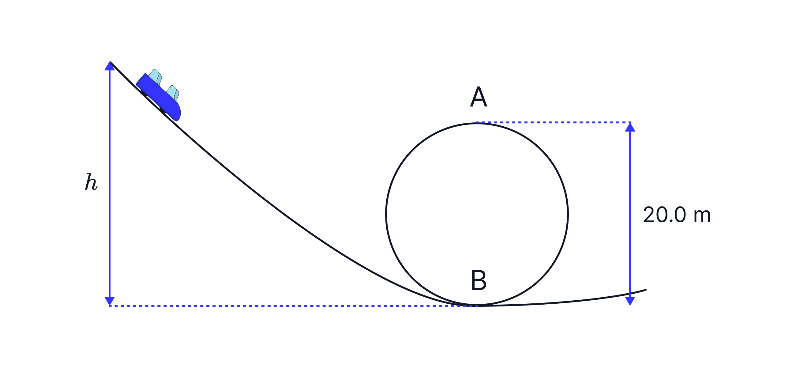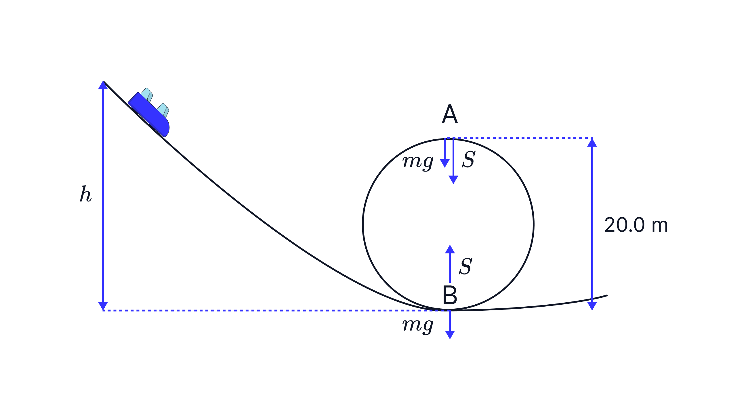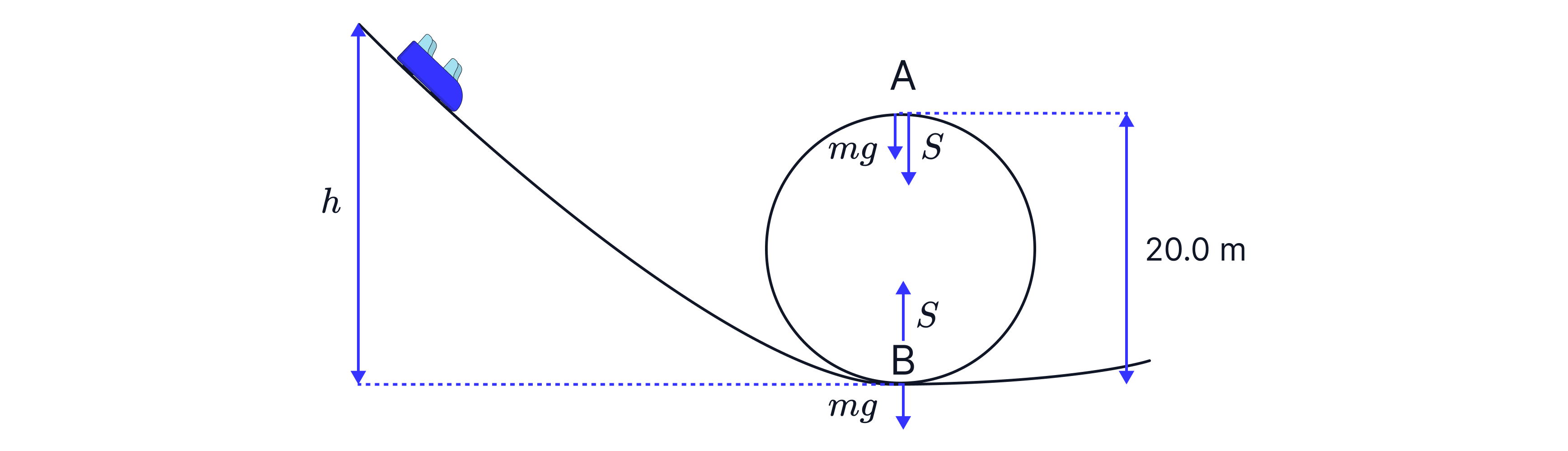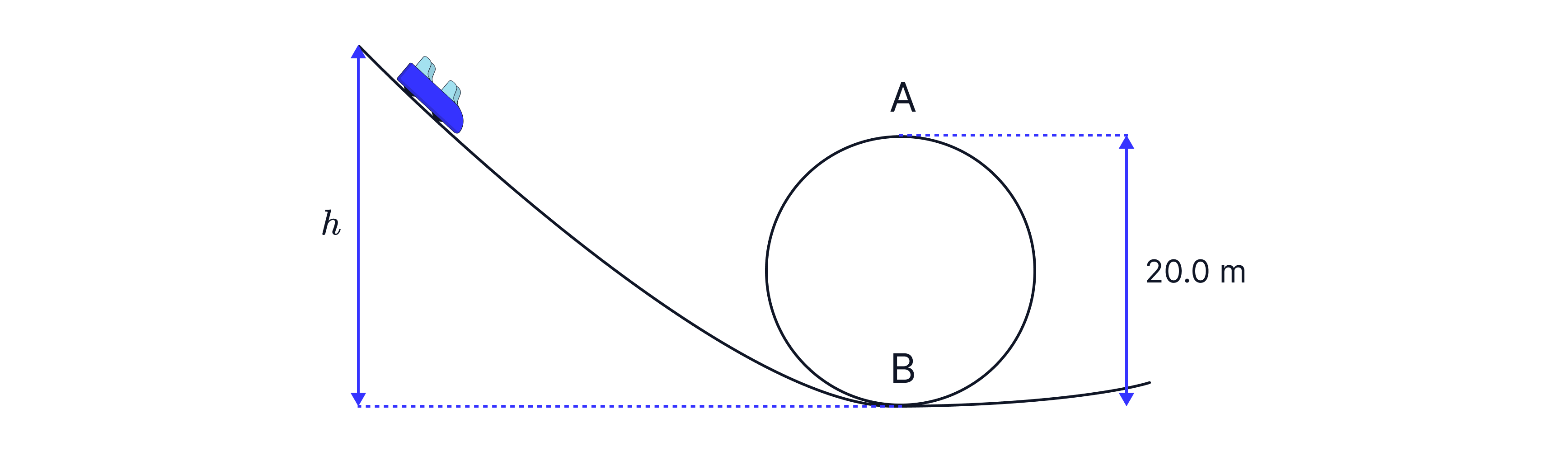The diagram below shows a rollercoaster approaching a loop. At height h it is stationary.