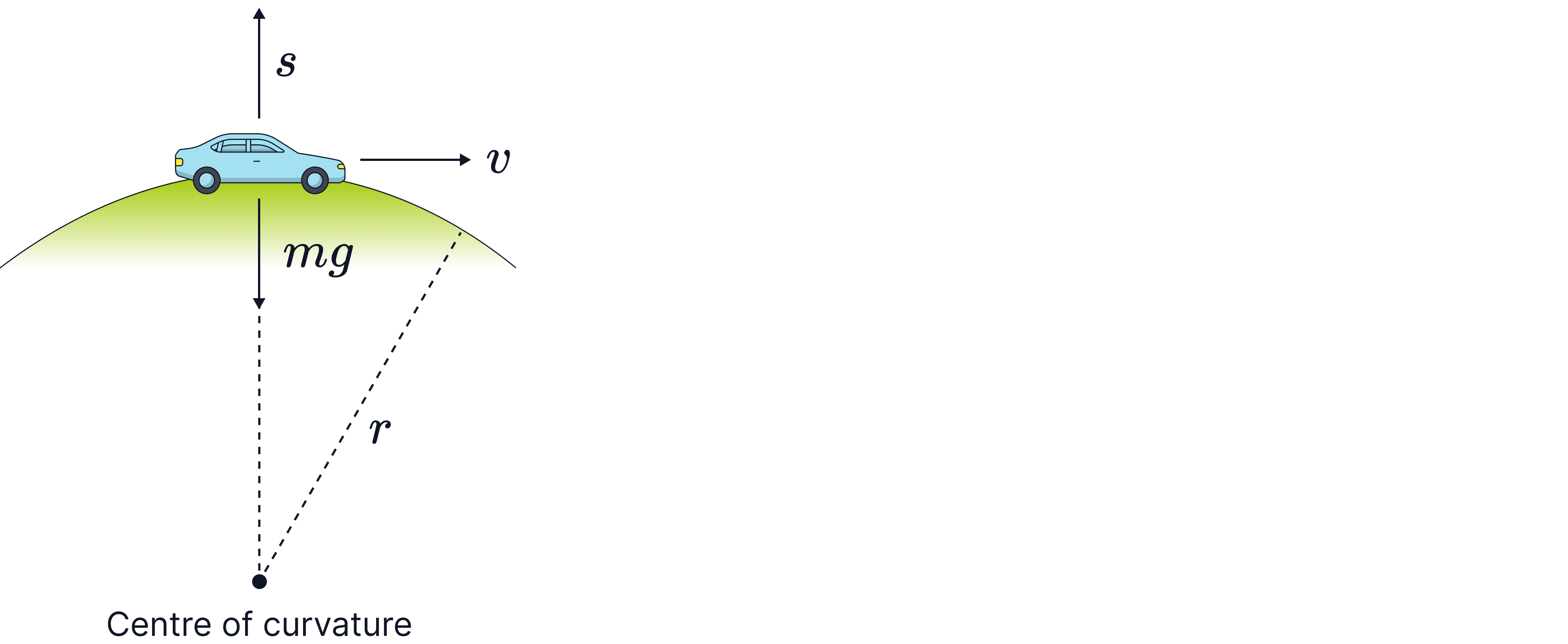 Here the force of gravity is causing the centripetal force. As the car is moving in circular motion, we know there must be a resultant force acting towards the centre of the circle. Therefore, the downward force of gravity must be greater than the support force.