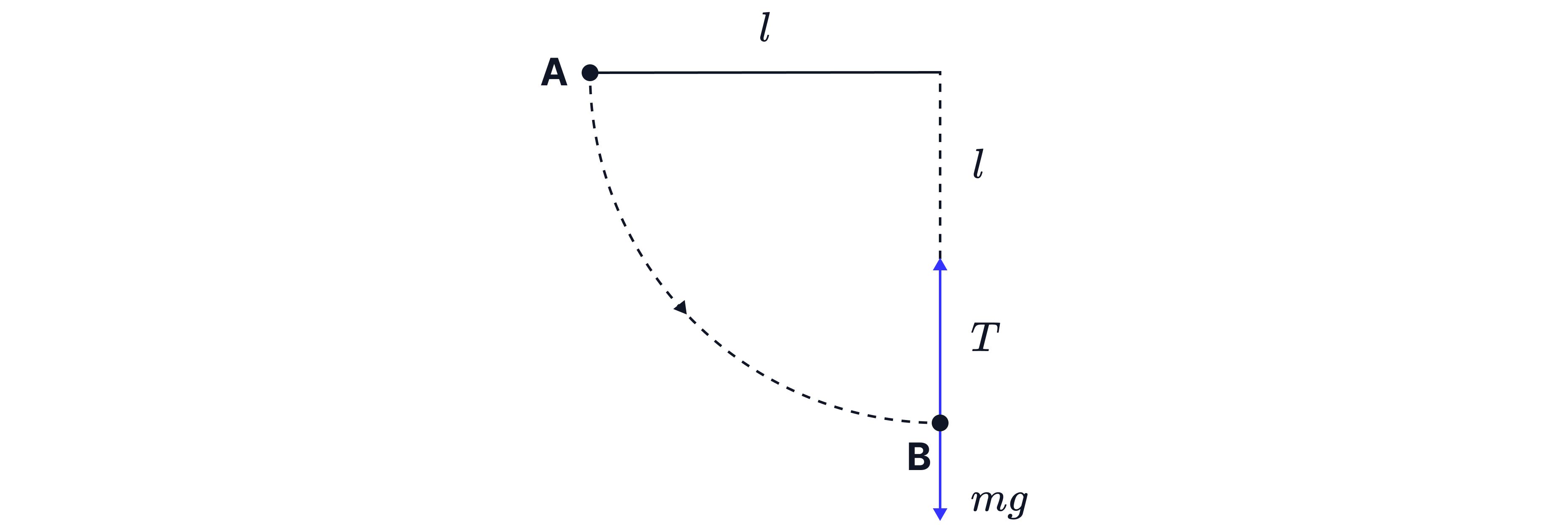 A ball of mass , at the end of a string, length , is released from rest at point A. The ball swings in a circular path, passing through the lowest point B at speed . The tension in the string at point B is .