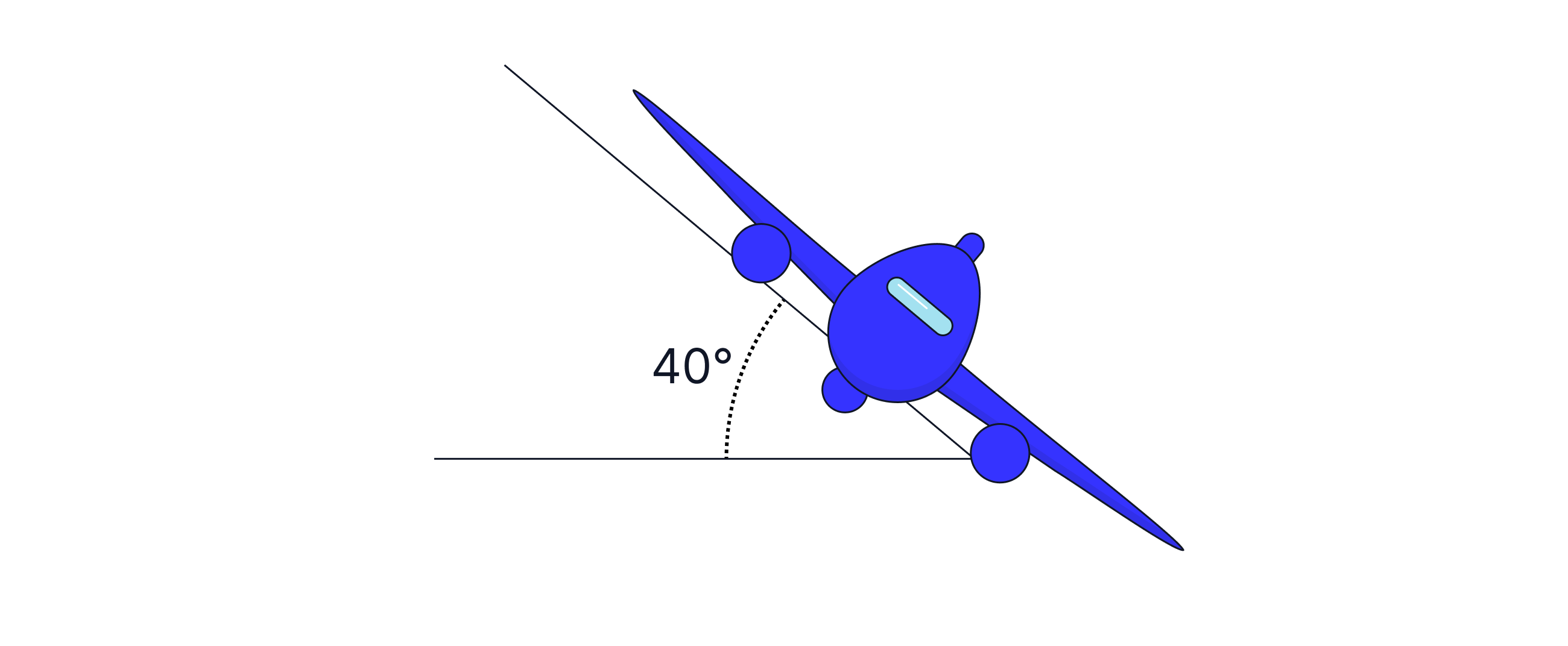 A plane flying as shown attempts to change direction at a constant speed of . Find the radius of curvature when the plane banks at an angle to the horizontal.