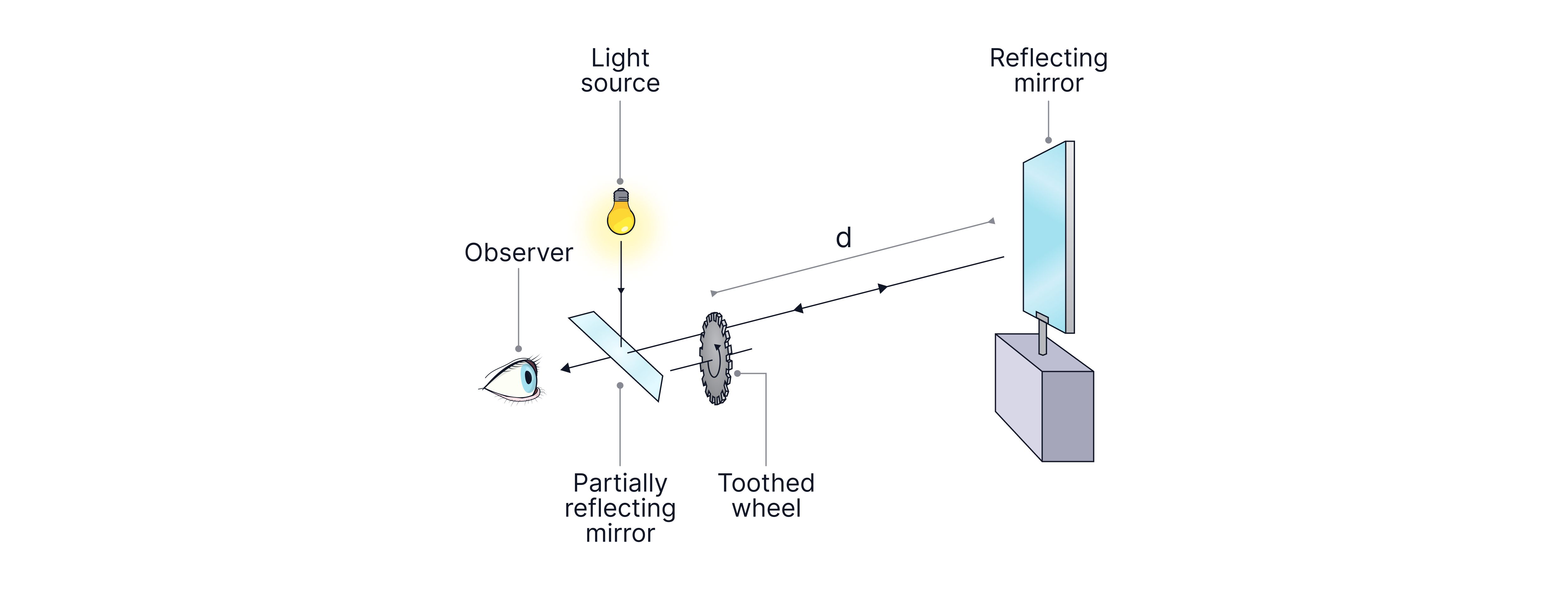 He placed a rapidly rotating toothed wheel between the light source and the distant mirror. The light passed through one of the gaps in the wheel, travelled a distance d to the mirror, reflected back, and then had to pass through the wheel again to reach the observer’s eye.