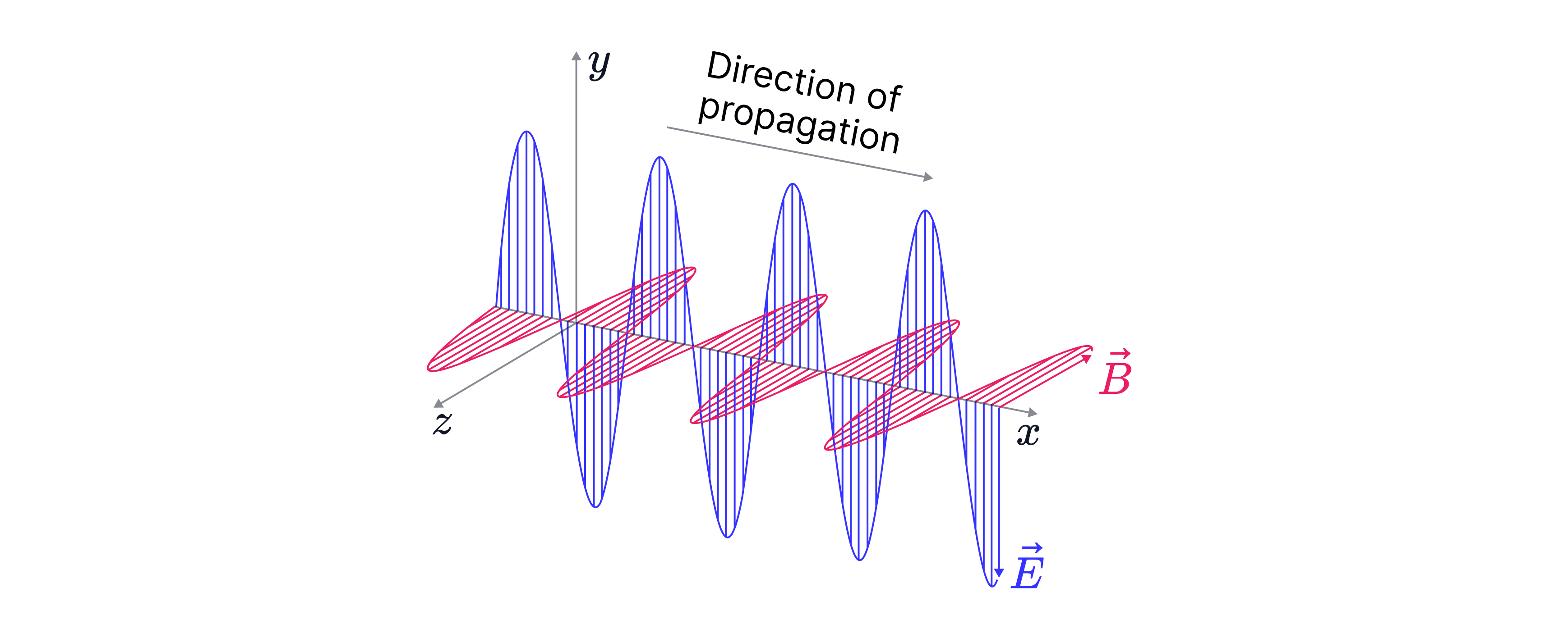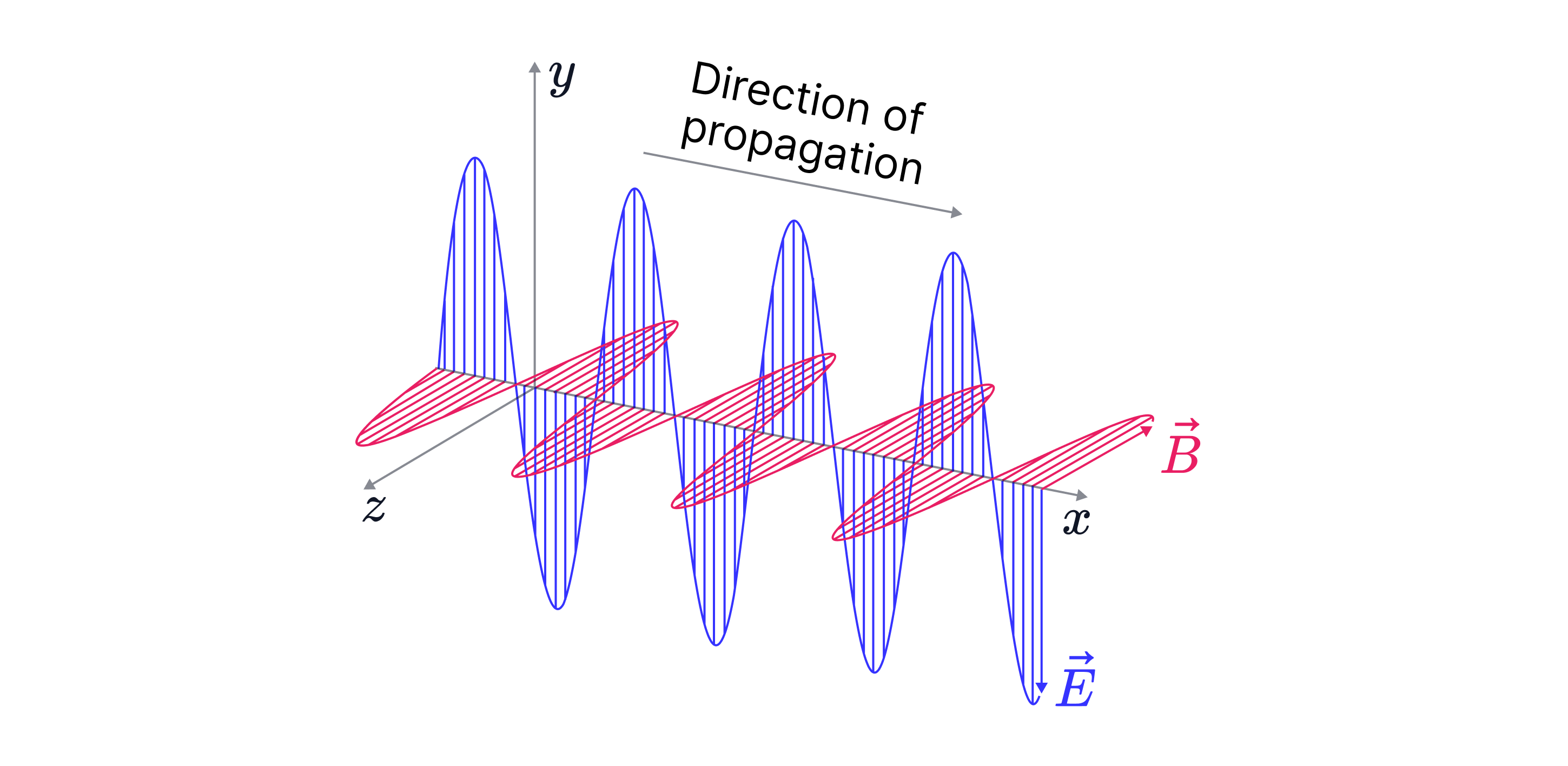 The electric field E and magnetic field B oscillate at to the direction of propagation – in other words, EM waves are transverse waves.