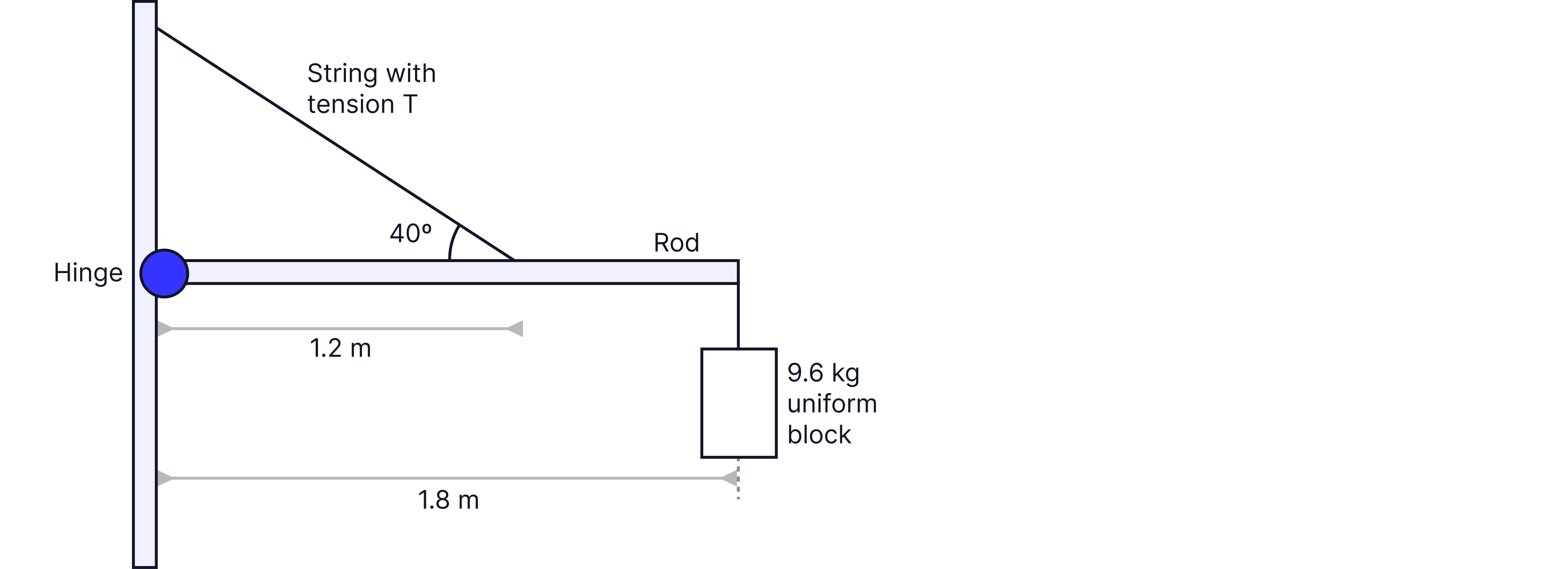 The diagram shows a horizontal rod attached to the wall by a hinge and held in place by a string. The rod has negligible mass.