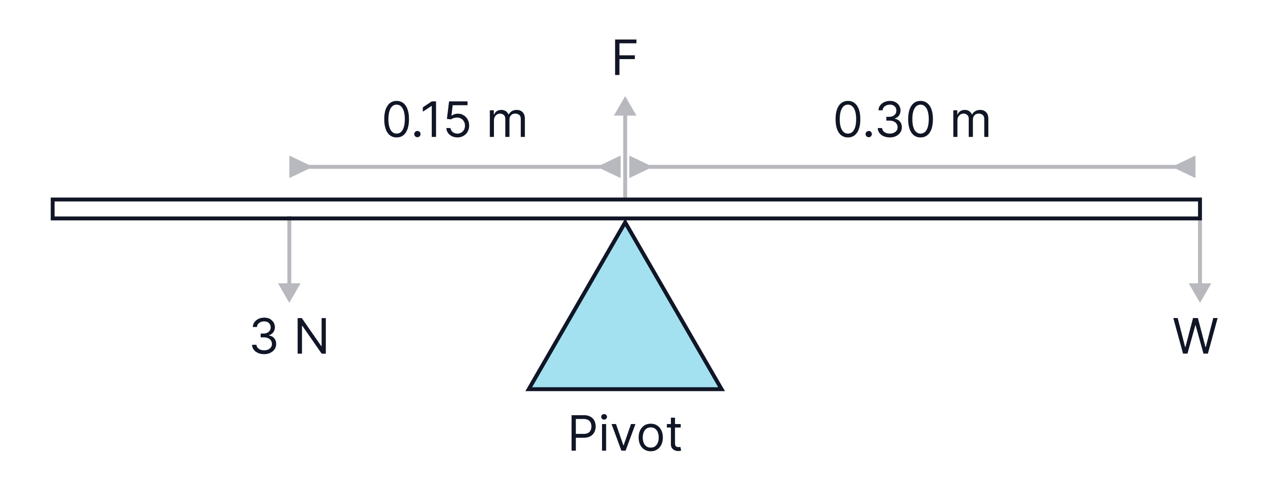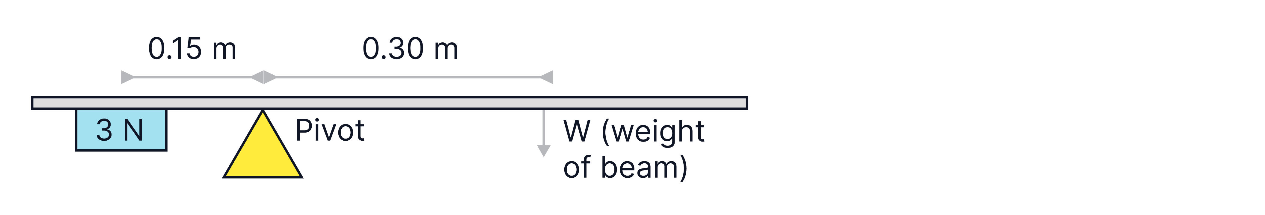 We can apply the conditions above to solve for the weight of the beam below and to calculate the force at the pivot.