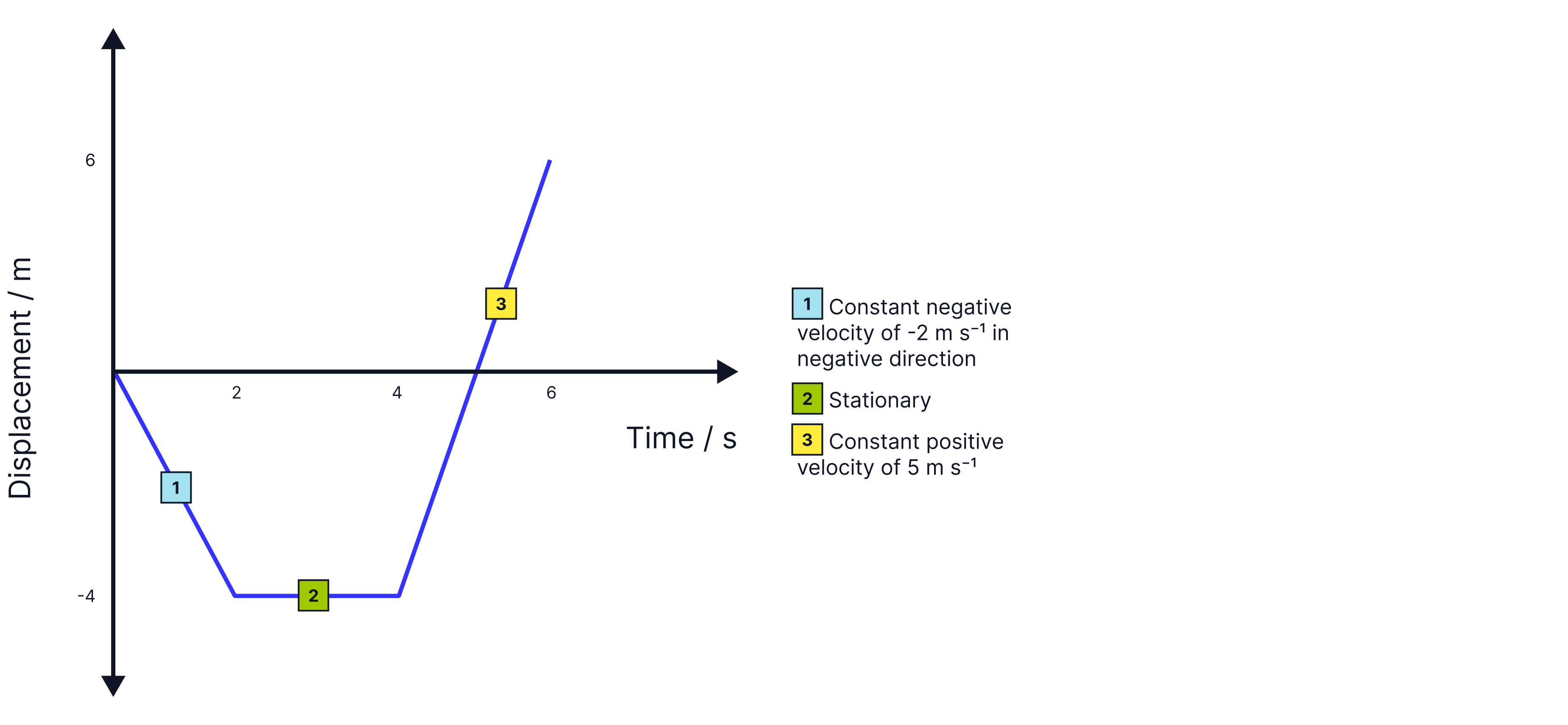 Constant negative velocity of, , which tells us that the object is moving at in the negative direction / to the left.