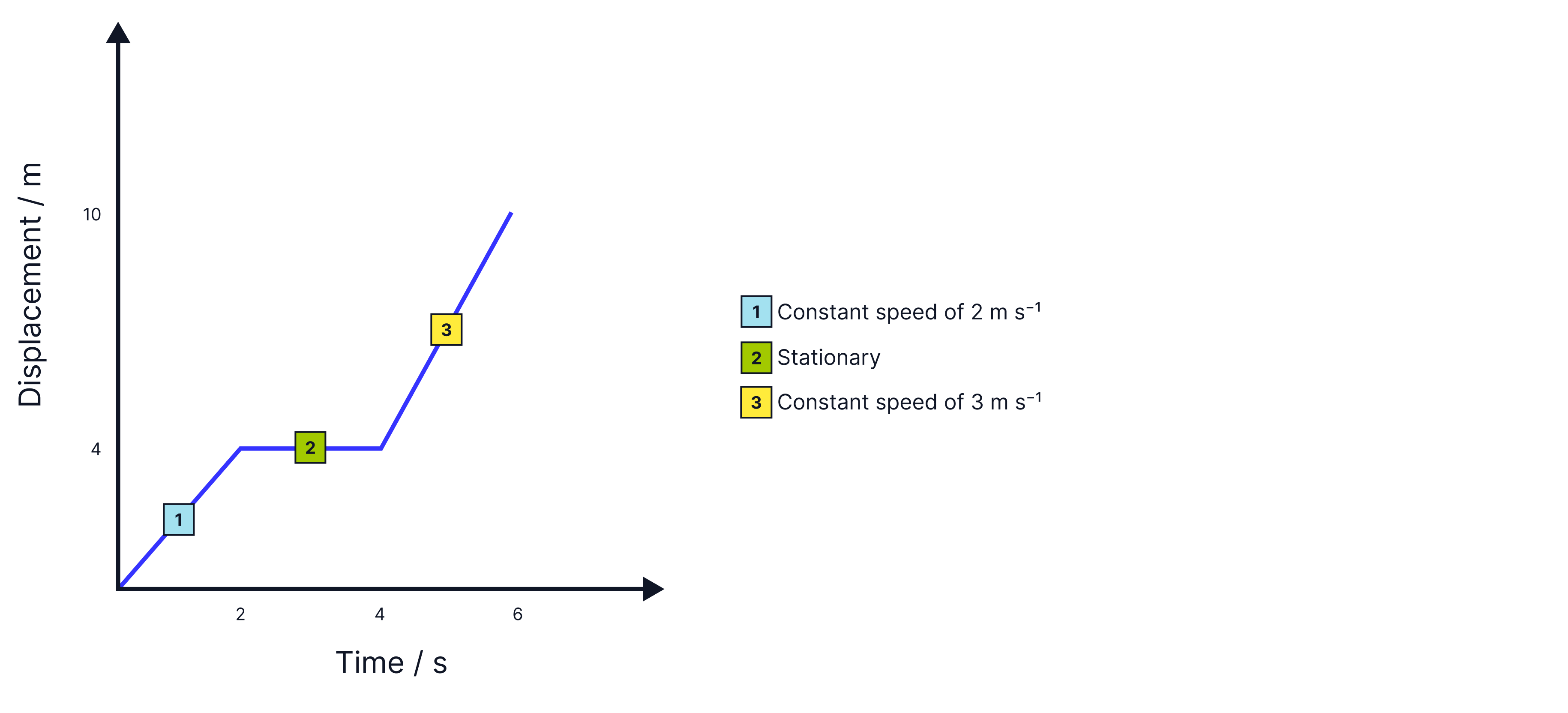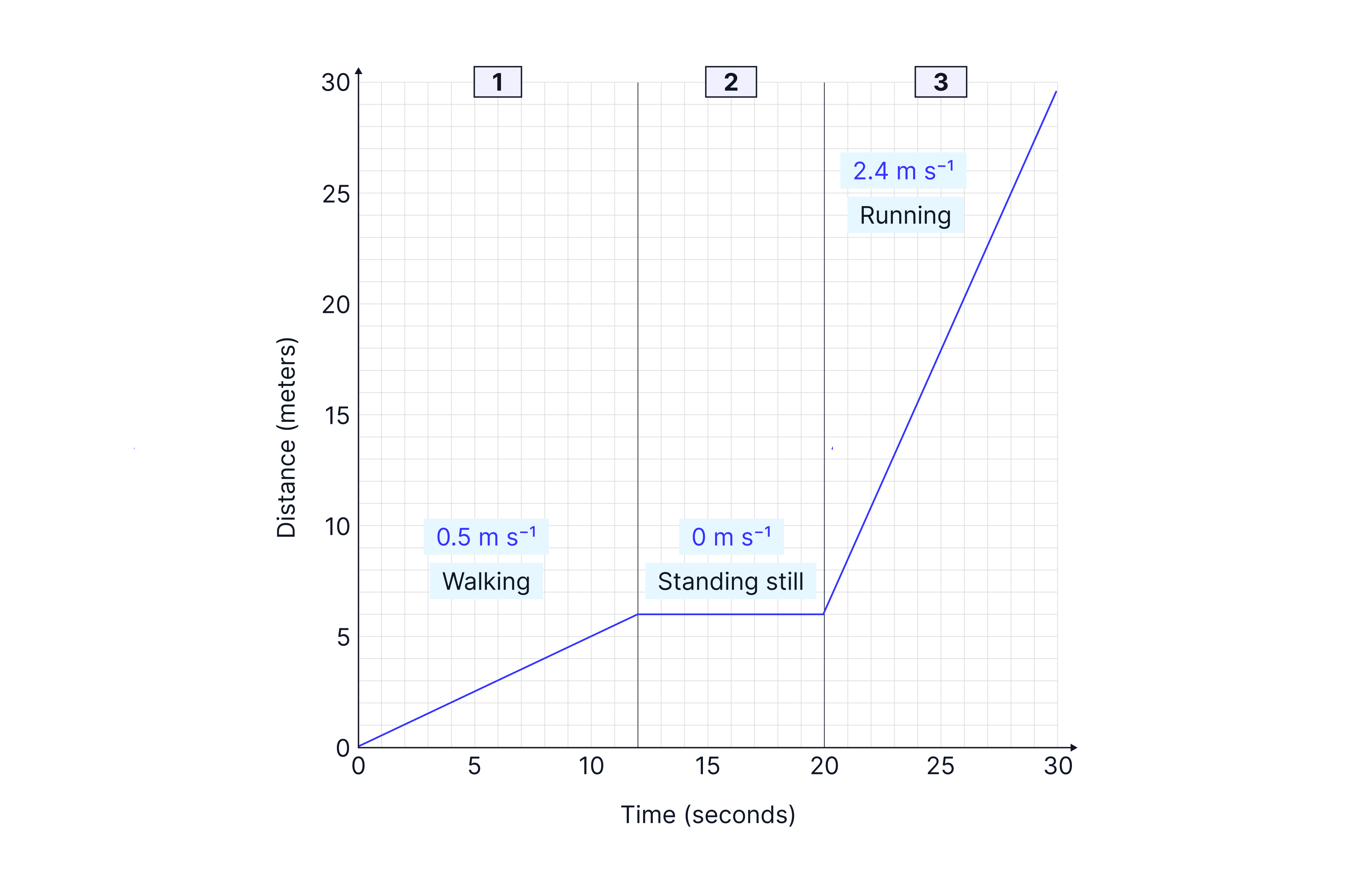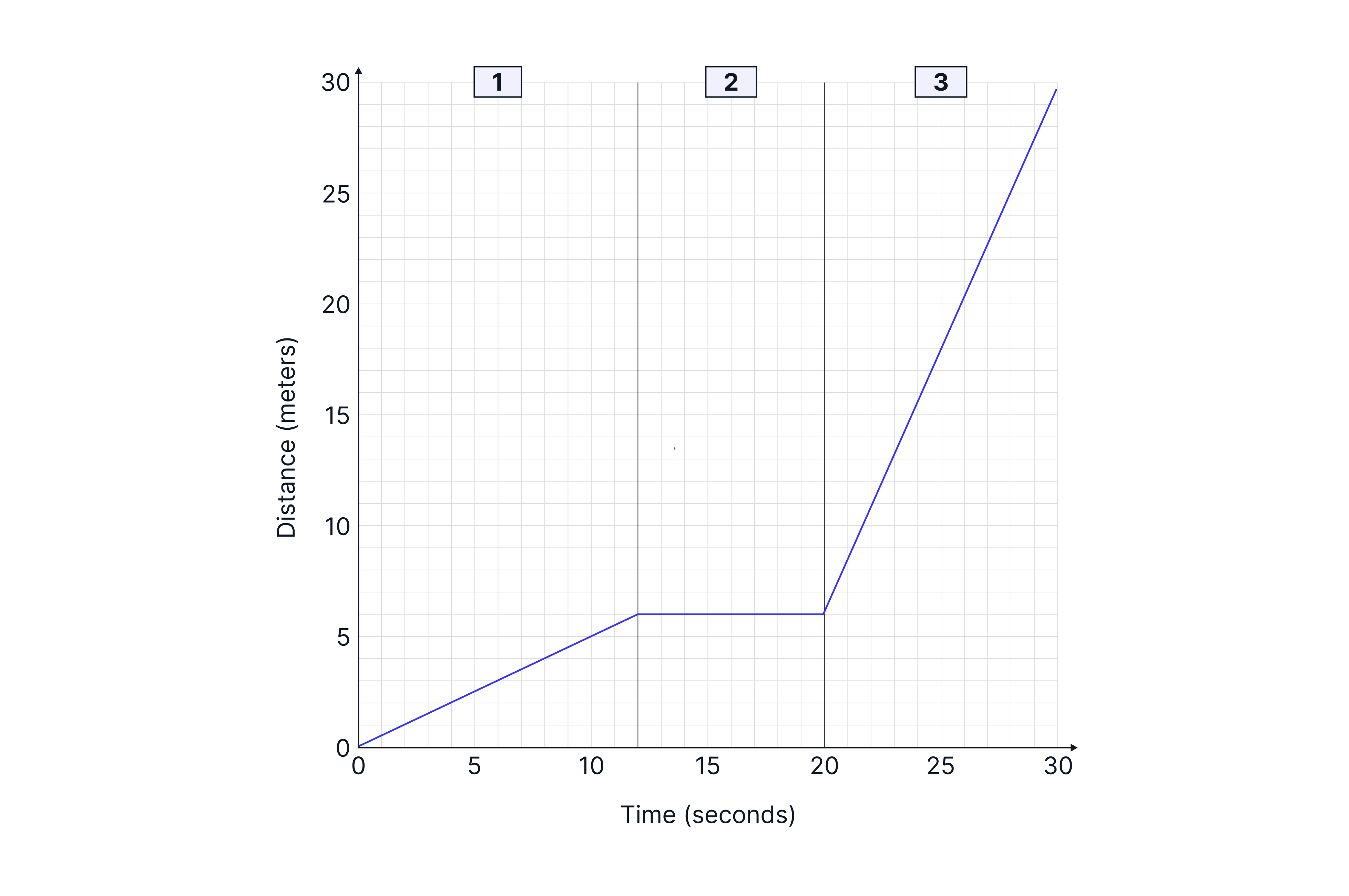 I leave school on foot and walk towards the shops, covering the first 6 metres in 12 seconds. I then saw my friend and stopped to chat; we only talked for 8 seconds. The shop is closing soon, so I ran the remaining 24 metres to the shop in 10 seconds.