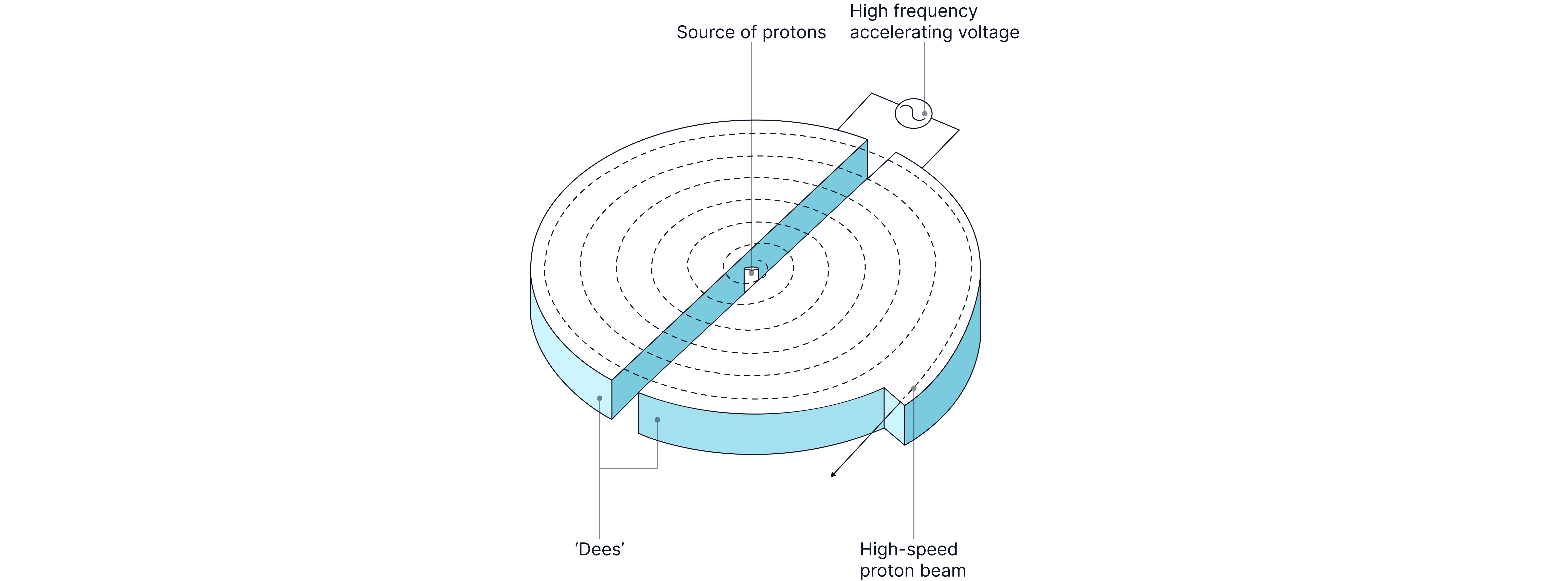 A cyclotron produces high-energy proton beams for radiation therapy. A cyclotron consists of two hollow, semi-circular metal electrodes called 'dees'. A uniform magnetic field is applied perpendicular to the plane of the dees. A high-frequency alternating voltage is applied between the dees, creating an electric field across the gap between them.