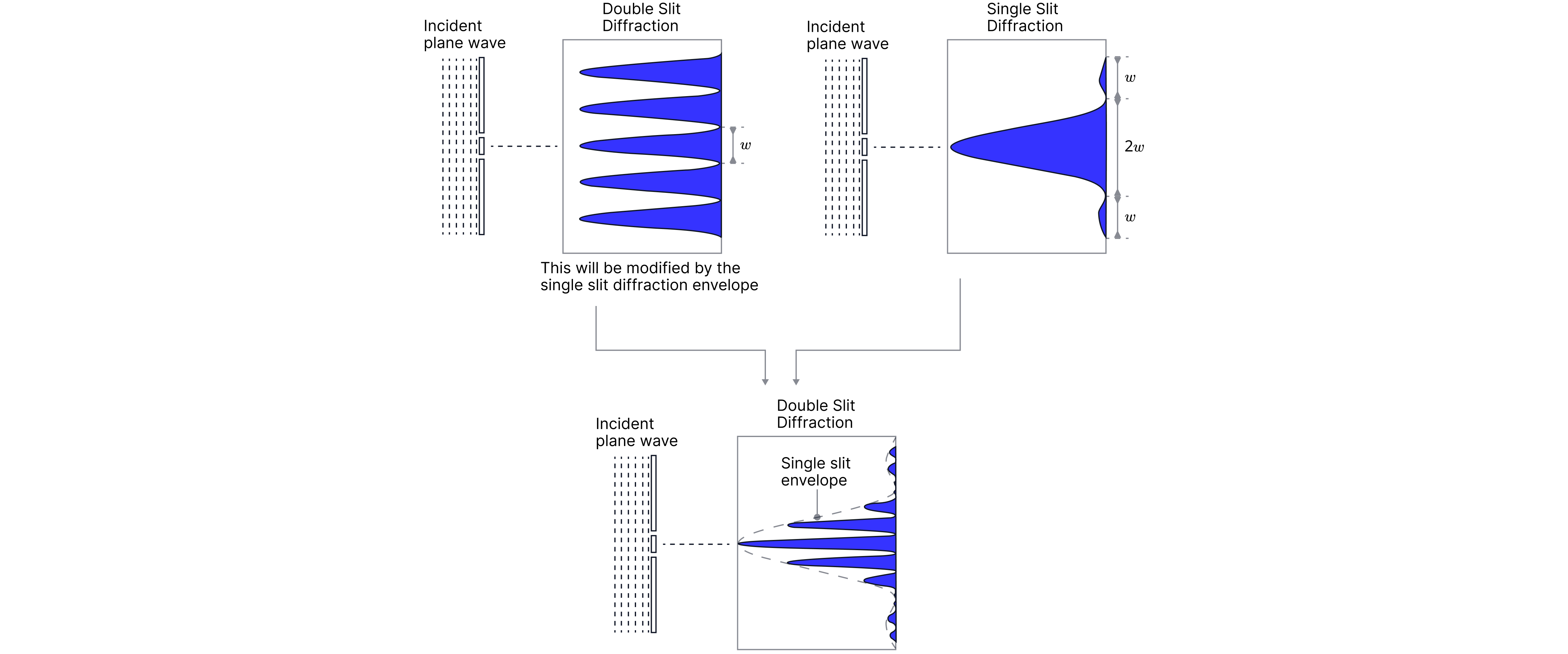 The actual pattern from a double slit is then a combination of the patterns from the single slit and double slit experiments, but you will not get asked to draw this, it is just here for reference.