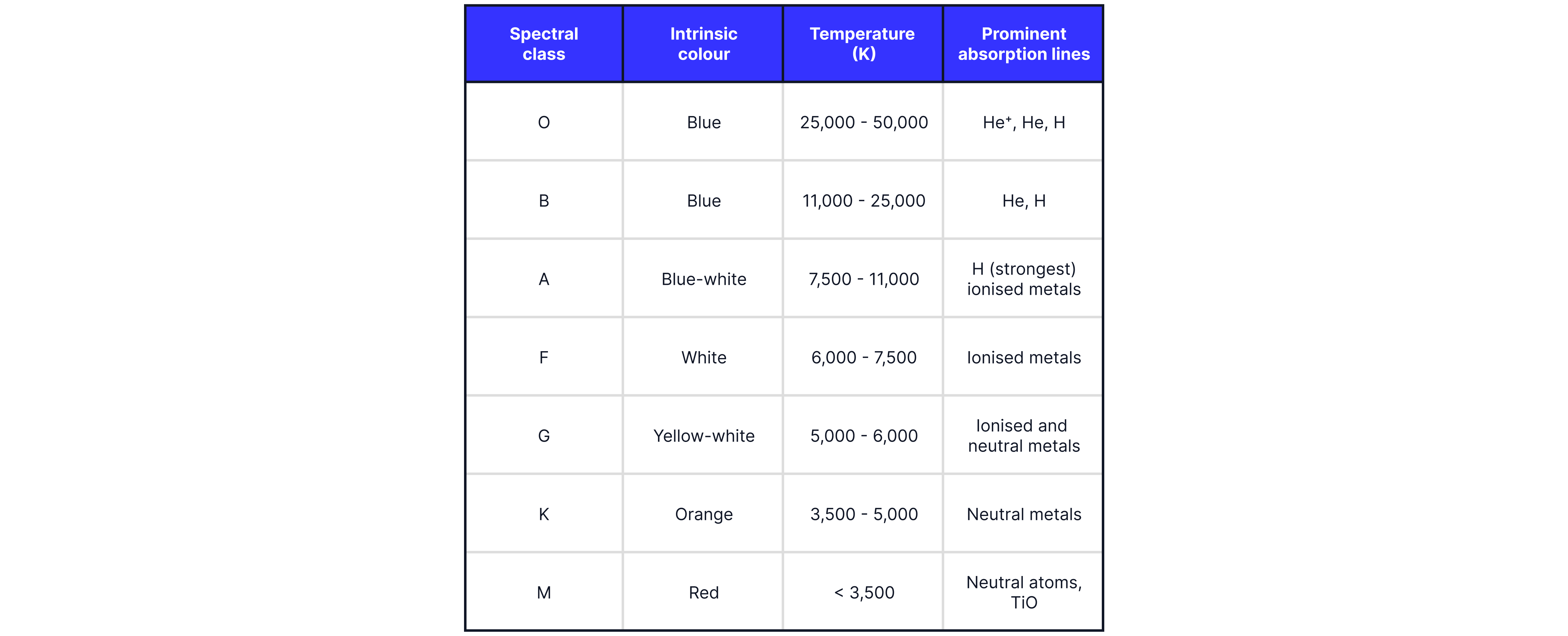 Hotter stars will therefore emit most of their light in the blue region of the spectrum, whilst cooler stars appear red as they emit most light at longer wavelengths. This is how stars were mainly classified, see the table below: