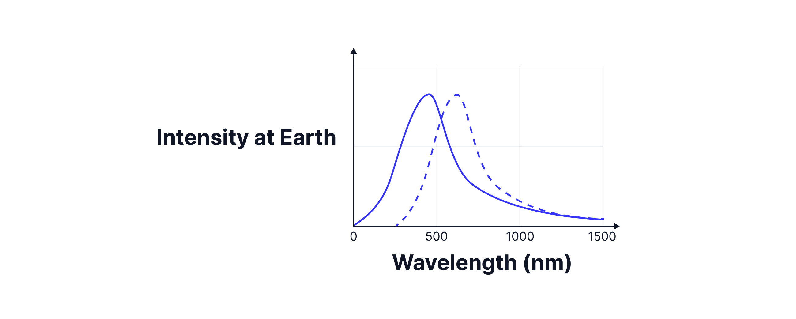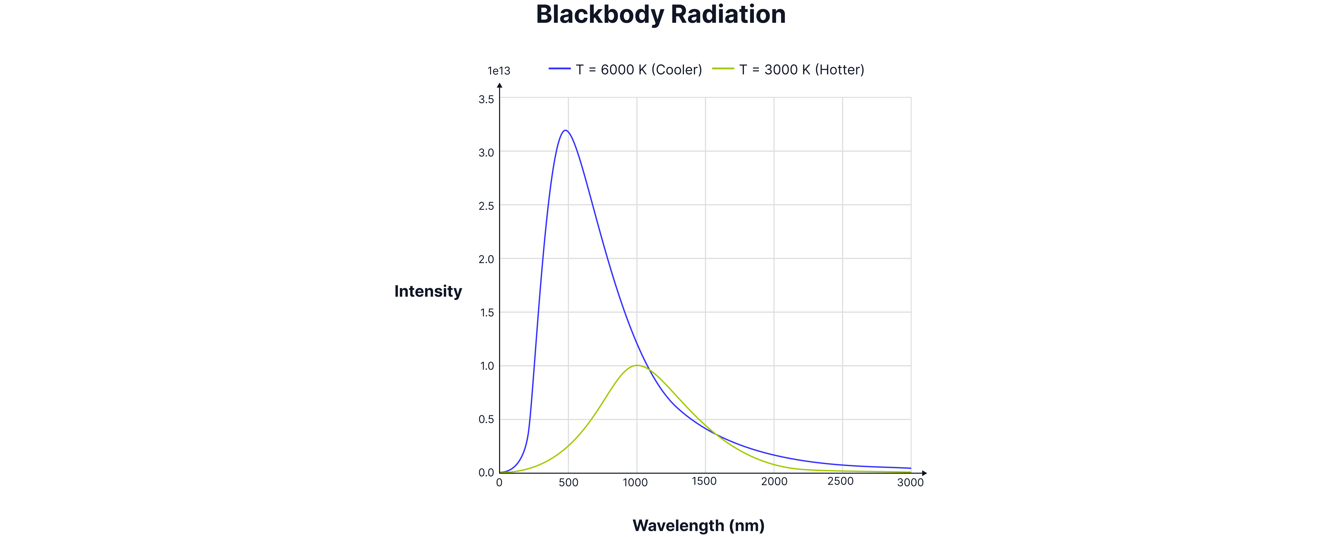 Hotter stars produce blackbody curves that peak at shorter wavelengths according to Wien’s displacement law: