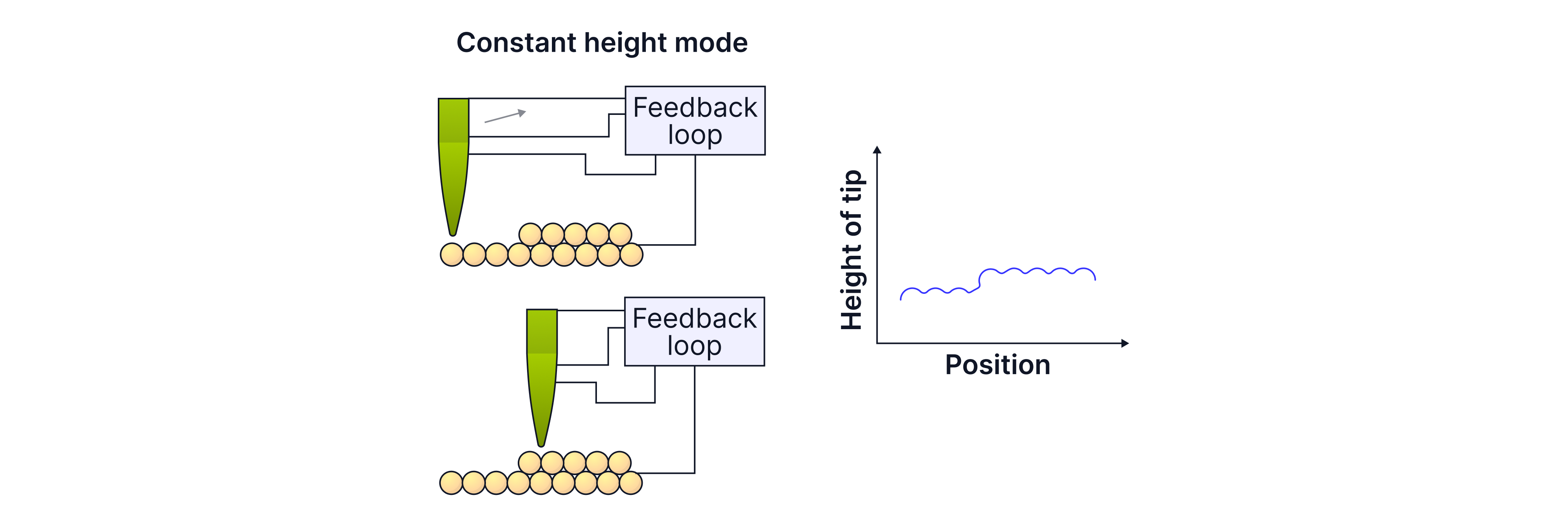 Constant height: tip height fixed; current varies with position and is recorded to map the surface.