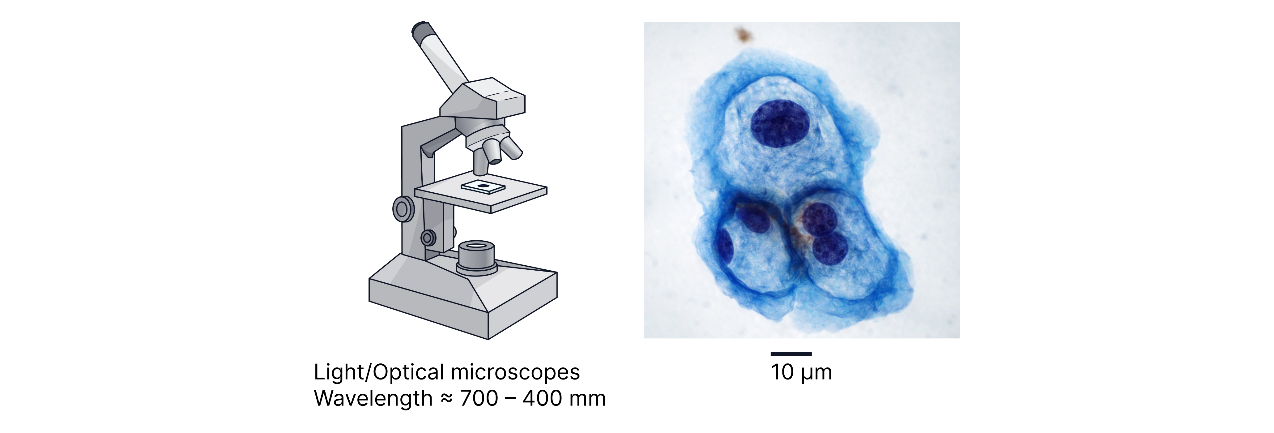 A microscope can only resolve details down to about the same order as the wavelength being used (shorter wavelength → better resolution). Visible light has wavelength roughly 400–700 nm, so optical microscopes struggle to resolve features much smaller than this scale.