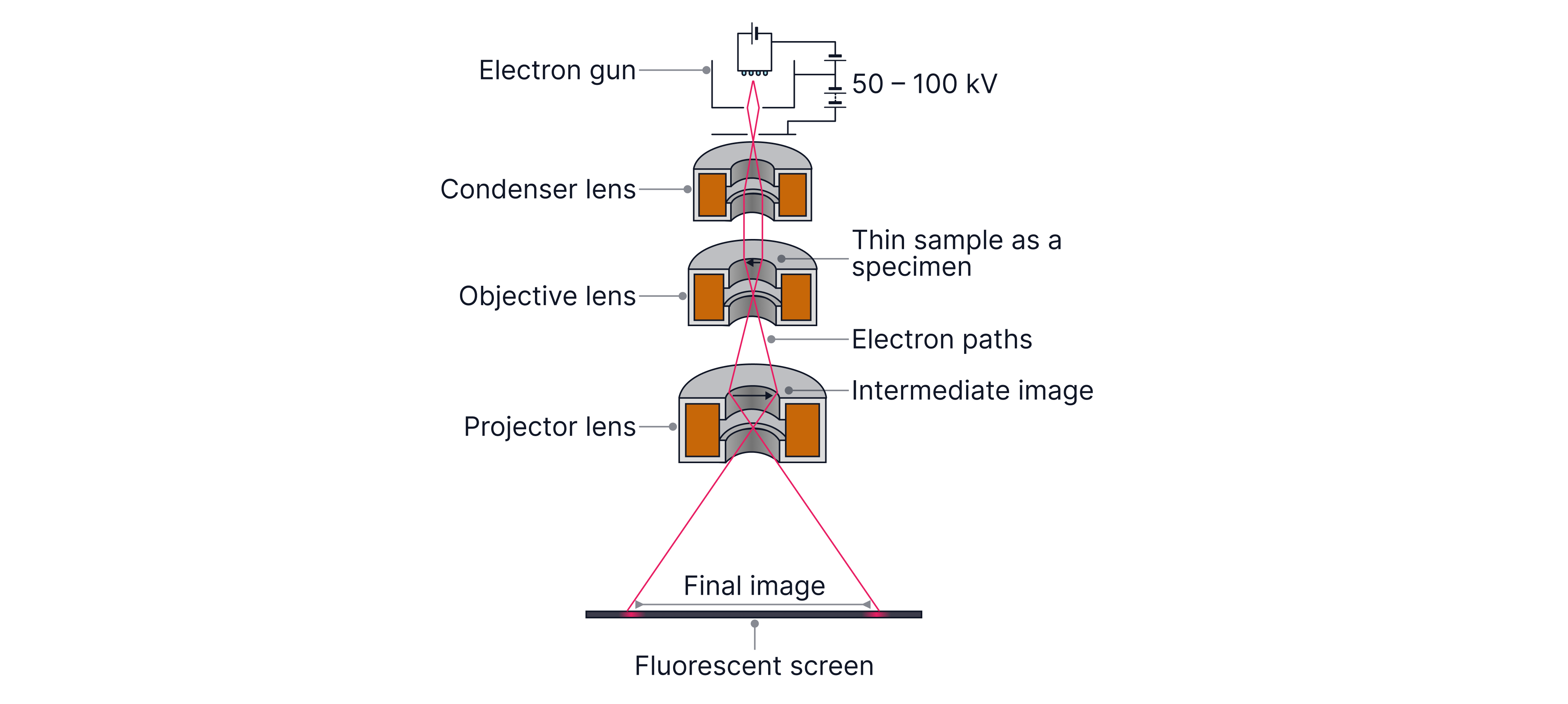 Why lenses are magnetic (not glass): electrons are charged, so their paths can be bent and focused by magnetic fields.