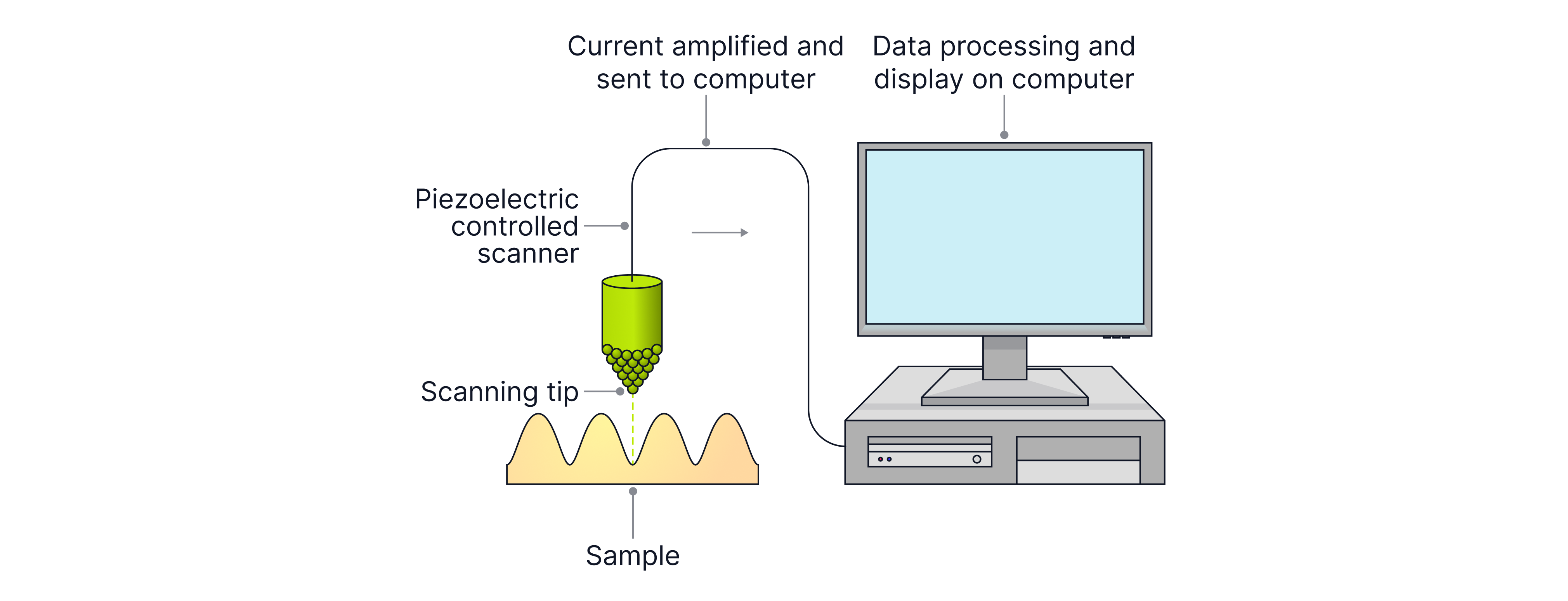 Key idea: tunnelling probability (and current) is extremely sensitive to the gap: smaller gap → larger current; larger gap → smaller current.