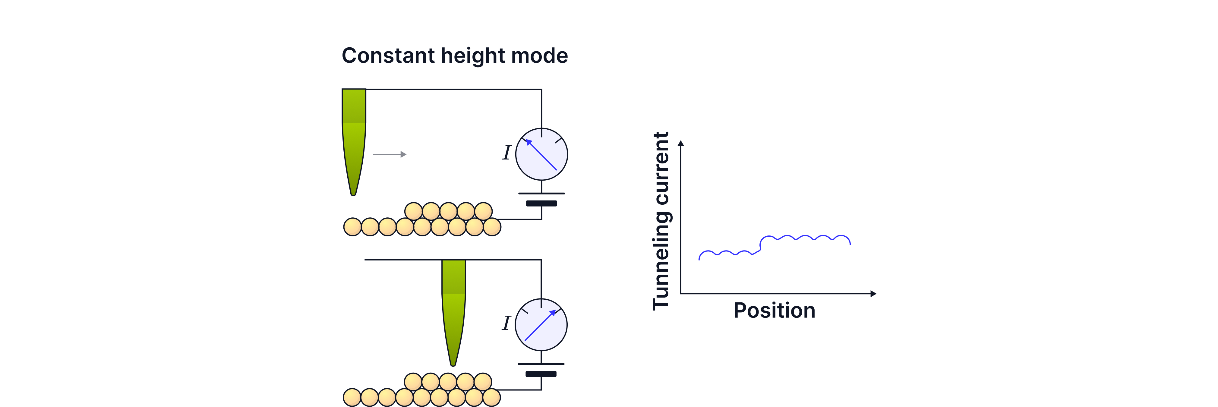 With the tip about 1 nm from the surface, electrons have a finite probability of tunnelling across the gap due to their wave nature. A small p.d. drives electrons across in one direction, producing a tunnelling current. In constant height mode the tip height is kept constant; changes in surface height change the gap width, which changes tunnelling probability and therefore the current. Recording current versus position produces a surface map.